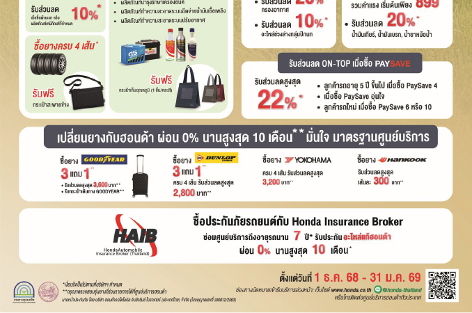 บริษัท ฮอนด้า ออโตโมบิล (ประเทศไทย) จำกัด เสิร์ฟความอุ่นใจส่งท้ายปีกับแคมเปญสุดพิเศษ “Happy Holiday Happy Plus! เที่ยวทั่วไทย คุ้มสบายใจ” พร้อมดูแลรถยนต์คู่ใจแบบครบวงจร สำหรับครอบครัวฮอนด้าบริการตรวจสภาพรถยนต์ฟรี* พร้อมผ่อนสบายไร้กังวล ! สำหรับงานบริการทุกประเภท ผ่อนชำระ 0% นานสูงสุด 8 เดือน* อัปเกรดความคุ้มค่า รับส่วนลดผลิตภัณฑ์ที่กำหนดมูลค่าสูงสุด 20%* สำหรับครอบครัวฮอนด้าทั้งลูกค้ารถใหม่ รถเก่า และรถมือสอง พร้อมโปรแกรมผ่อนชำระยางรถยนต์ 0% นานสูงสุด 10 เดือน* สิทธิพิเศษสุดคุ้มที่ครบ จบ ทุกความต้องการ ! เพียงนัดหมายและนำรถยนต์เข้ารับบริการที่ศูนย์บริการรถยนต์ฮอนด้าทั่วประเทศ ตั้งแต่วันที่ 1 ธันวาคม 2568 ถึง 31 มกราคม 2569