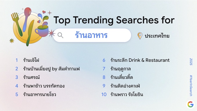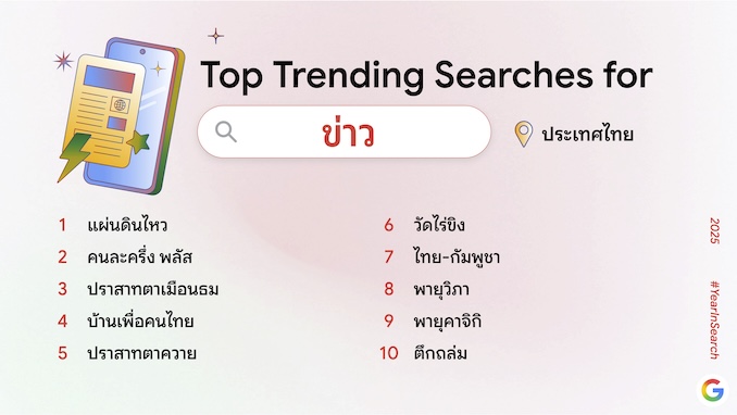 Google ประเทศไทย เผยผล “Year in Search 2025” รายงานสรุปคำค้นหายอดนิยมประจำปีที่สะท้อนภาพรวมความสนใจของคนไทยตลอดปี 2568 ไม่ว่าจะเป็นเหตุการณ์สำคัญที่เป็นกระแส เทรนด์ AI ที่มาแรงต่อเนื่อง บุคคลและข่าวเด่นที่ถูกพูดถึงทั่วประเทศ ตลอดจนเทรนด์ท่องเที่ยวทั้งในไทยและต่างประเทศ รวมถึงกิจกรรมยอดนิยมอย่างสูตรอาหาร วิธีทำ และหมวดความบันเทิงที่ครองใจผู้ค้นหาตลอดทั้งปี ผลลัพธ์ทั้งหมดสะท้อนจังหวะการเปลี่ยนแปลงของพฤติกรรมผู้ใช้อย่างรอบด้าน พร้อมตอกย้ำบทบาทของ Google Search ในฐานะเครื่องมือหลักที่อยู่ในทุกช่วงความสนใจ ความสุข และความทรงจำของคนไทยตลอดปีที่ผ่านมา