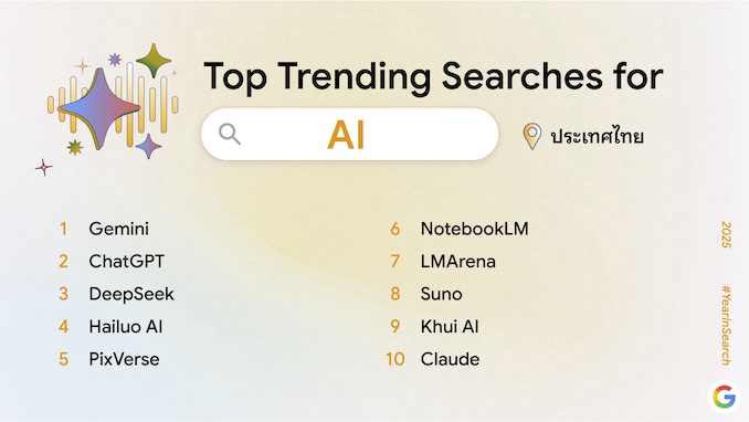 ผลการค้นหายอดนิยมปีนี้สะท้อนให้เห็นถึงการผสานกันของเทรนด์เทคโนโลยี เหตุการณ์สังคม และความบันเทิงที่ต่างมีบทบาทสำคัญในการขับเคลื่อนความสนใจของคนไทยตลอดทั้งปี โดยเฉพาะด้านเทคโนโลยีซึ่งยังคงโดดเด่นที่สุดในปีนี้ โดย “Gemini” ครองอันดับ 1 คำค้นหายอดนิยมประจำปี 2568 นอกจากนี้ “ChatGPT” และ “DeepSeek” ก็ติดโผ 10 อันดับแรกเช่นเดียวกัน ในด้านนโยบายภาครัฐที่เกี่ยวข้องกับไลฟ์สไตล์และความเป็นอยู่ของประชาชนอย่าง “เที่ยวไทยคนละครึ่ง” และ “คนละครึ่ง พลัส” ยังคงได้รับความสนใจอย่างต่อเนื่อง ขณะที่เหตุการณ์สำคัญอย่าง “แผ่นดินไหว” ทำให้ผู้คนหันมาค้นหาข้อมูลด้านความปลอดภัยเพิ่มขึ้น สำหรับหมวดความบันเทิง ซีรีส์ไทยยังคงครองกระแสแรงแซงโค้ง โดย “สงคราม ส่งด่วน” และ “คุณพี่เจ้าขาดิฉันเป็นห่านมิใช่หงส์” ได้รับความนิยมอย่างล้นหลาม รวมถึงแบบทดสอบเชิงจิตวิทยาออนไลน์ “กุญแจกลางใจ” ที่สร้างกระแสในโลกดิจิทัลตลอดปี ขณะที่ฝั่งเทคโนโลยีผู้บริโภค “iPhone 17” ยังคงเป็นหัวข้อที่ผู้ใช้งานชาวไทยติดตามอย่างใกล้ชิด