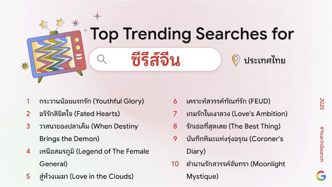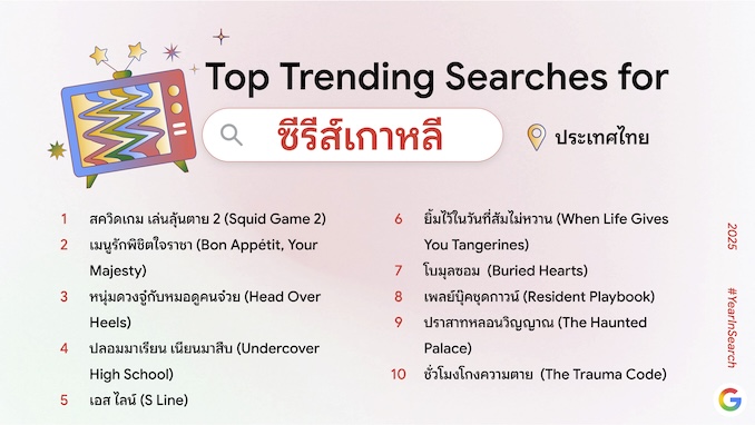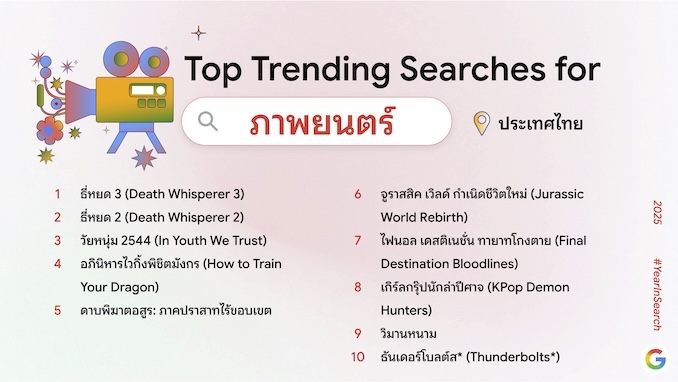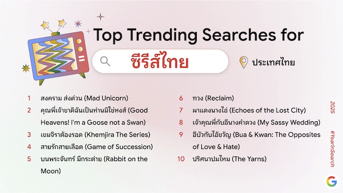 Year in Search ไม่เพียงสะท้อนภาพรวมความสนใจของคนไทยในปี 2568 แต่ยังรวบรวมคำค้นหายอดนิยมที่ชี้ให้เห็นกระแสระดับโลกด้วย สามารถดูข้อมูลเชิงลึกของเทรนด์การค้นหาในไทยและต่างประเทศได้ที่ https://yearinsearch.google/ (หมายเหตุ: สามารถเข้าลิงก์ได้ตั้งแต่วันที่ 4 ธันวาคม 2568 เวลา 15.00 น. เป็นต้นไป)