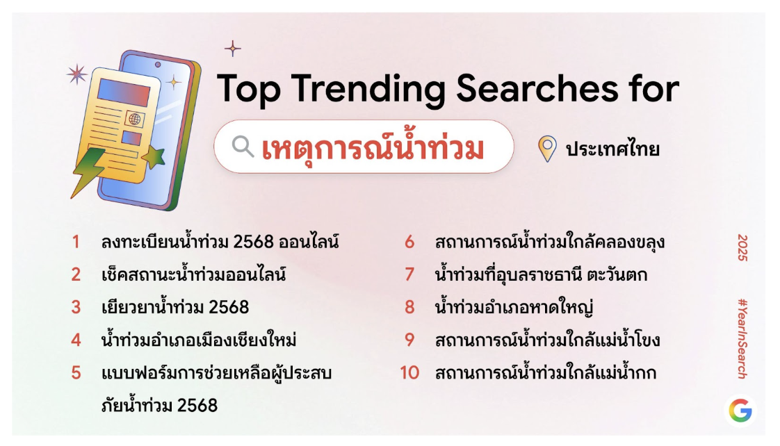 ความกังวลของคนไทยต่อสถานการณ์น้ำท่วมในหลายพื้นที่ของประเทศ ซึ่งส่งผลต่อชีวิตประจำวันทั้งการเดินทาง และความปลอดภัยสะท้อนผลอย่างชัดเจน โดย “ลงทะเบียนน้ำท่วม 2568 ออนไลน์” ครองอันดับ 1 คำค้นหายอดนิยมหมวดเหตุการณ์น้ำท่วม ตามด้วย “เช็คสถานะน้ำท่วมออนไลน์” “เยียวยาน้ำท่วม 2568” “น้ำท่วมอำเภอเมืองเชียงใหม่” “แบบฟอร์มการช่วยเหลือผู้ประสบภัยน้ำท่วม 2568” ในอันดับ 2- 5 ตามลำดับ และล่าสุด “น้ำท่วมอำเภอหาดใหญ่” ซึ่งเป็นเหตุการณ์ที่เกิดขึ้นได้ไม่นาน ก็พุ่งขึ้นมาติดโผใน 10 อันดับแรกอย่างรวดเร็ว