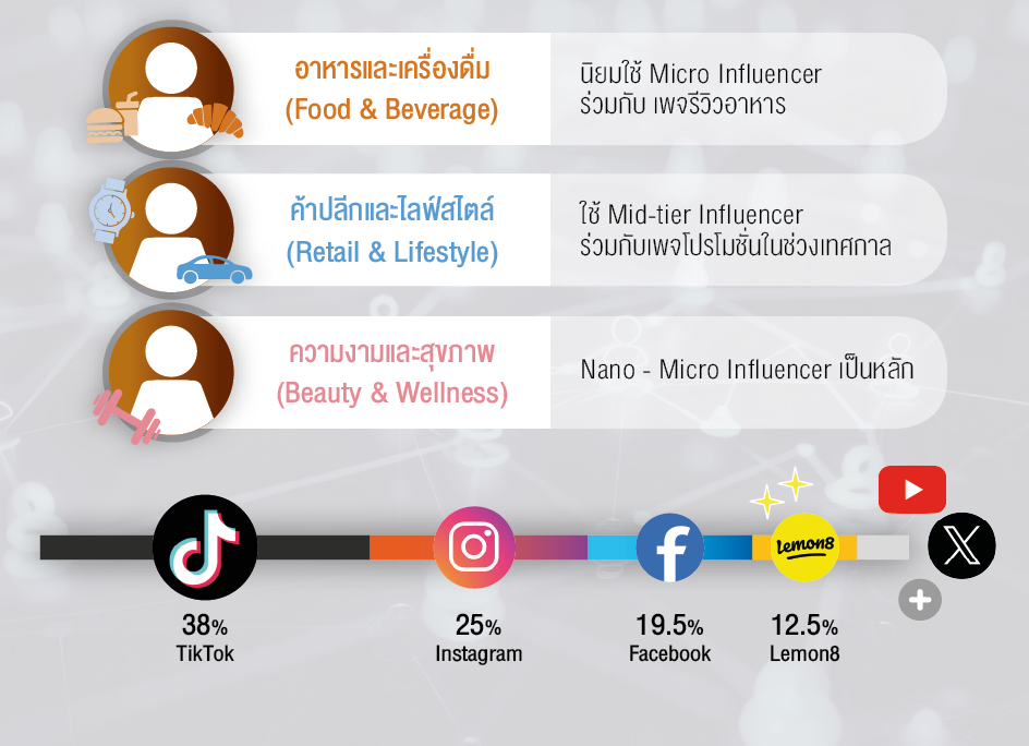 ไล่เรียงตั้งแต่ Food & Beverage นิยมใช้ Micro Influencer ร่วมกับ เพจรีวิวอาหาร เพื่อดันยอดขายและ Walk-in, Retail & Lifestyle ใช้ Mid-tier Influencer ร่วมกับเพจโปรโมชั่นในช่วงเทศกาล, Beauty & Wellness พึ่งพา Nano/Micro เป็นหลักเพื่อสร้างความน่าเชื่อถือและผลลัพธ์จริง, FMCG & Mass Product เลือกใช้ Macro/Mega Influencer ร่วมกับ เพจ Mass Entertainment เพื่อสร้างการรับรู้ในวงกว้าง