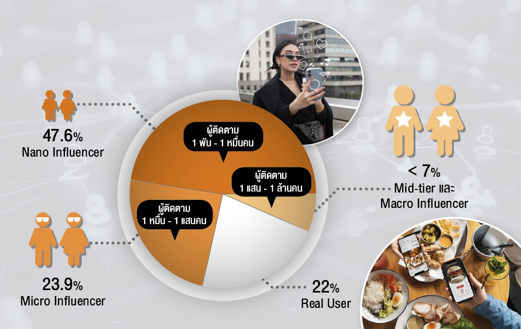 จากการเปลี่ยนแปลง Influencer Marketing ดังกล่าวส่งผลให้ Nano & Micro Influencer เป็นที่ต้องการของแบรนด์เพิ่มมากขึ้น หากย้อนดูโครงสร้างตลาด Influencer Marketing ไทย พบว่า Nano และ Micro Influencer กำลังครองตลาดอย่างแท้จริง ด้วยค่าเฉลี่ย Engagement (ER%) อยู่ระหว่าง 6-9% ซึ่งสูงที่สุดเมื่อเทียบกับกลุ่มอื่น ซึ่ง Nano Influencer ครองสัดส่วนตลาดสูงถึง 47.6% ขณะที่ Micro Influencer ตามมาที่ 23.9% Real User 22% และ Mid-tier และ Macro Influencer รวมกันไม่ถึง 7% เท่านั้น