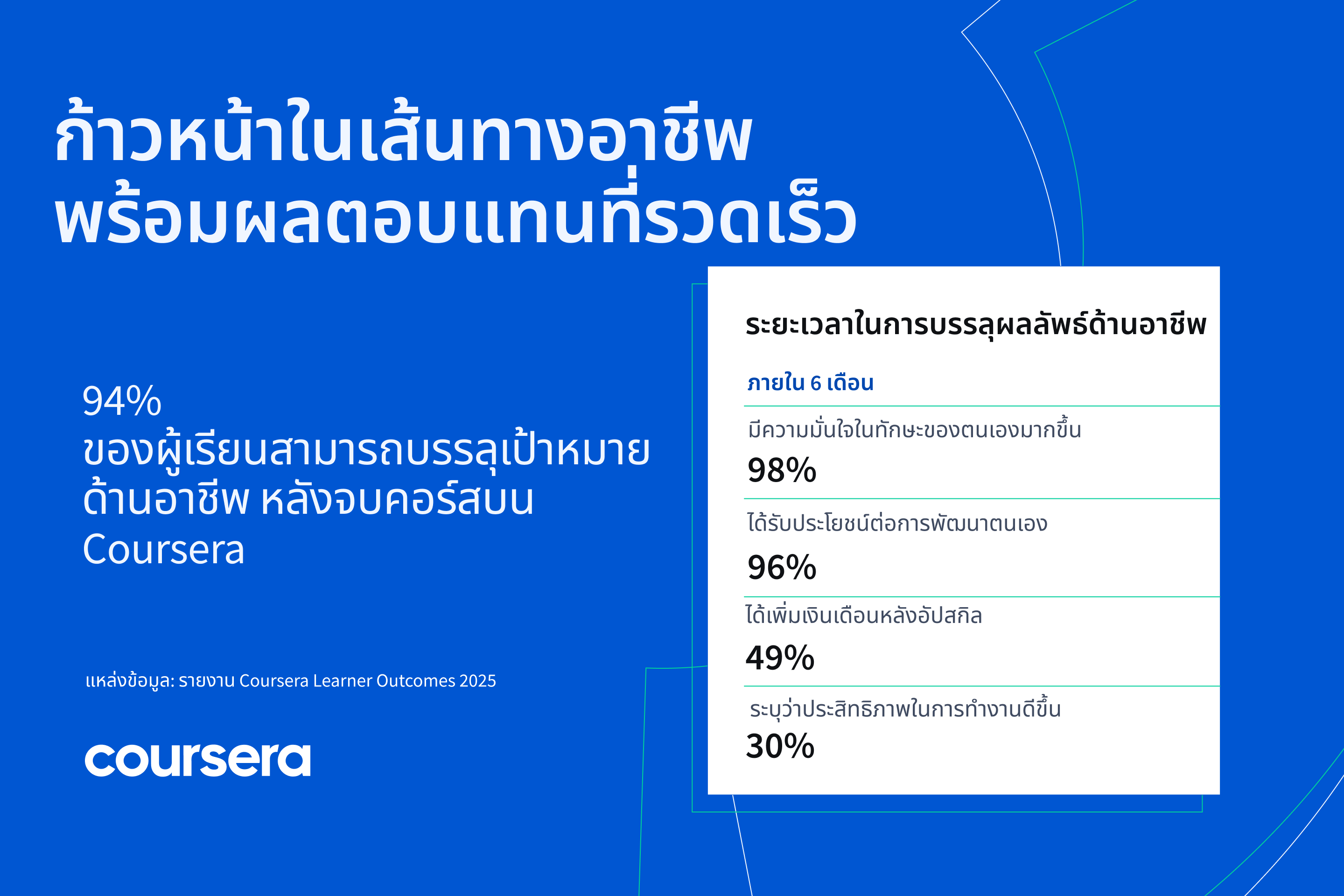 ผลจากการยกระดับทักษะยังสะท้อนเป็นผลลัพธ์เชิงบวกอย่างเป็นรูปธรรม โดย Coursera Learner Outcomes Report 2025 ระบุว่า 94% ของผู้เรียนในภูมิภาคเอเชียแปซิฟิกรายงานผลลัพธ์ทางอาชีพในเชิงบวก ตัวอย่างเช่น ได้งานใหม่ หรือเลื่อนตำแหน่ง อีก 49% มีรายได้เพิ่มขึ้น และ 96% ของผู้เรียนได้รับประโยชน์เชิงส่วนตัว เช่น ความมั่นใจที่เพิ่มขึ้นและความภาคภูมิใจในความสำเร็จ