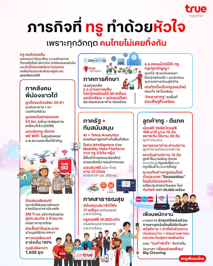 ทรู เดินหน้า “ภารกิจแห่งหัวใจ” เพื่อให้ลูกค้าคนสำคัญยังใช้งานได้อย่างต่อเนื่องแบบไร้กังวล มอบเน็ตฟรี 10GB โทรฟรี 100 นาที นาน 15 วัน พร้อมขยายวันใช้งานและขยายเวลาชำระค่าบริการทั้งแบบเติมเงินและรายเดือน ช่วยลดภาระในช่วงเวลาที่ยากลำบาก ยิ่งไปกว่านั้น ยังยกระดับความช่วยเหลือด้วยการ “ยกเว้นค่าบริการ” สำหรับลูกค้ามือถือ ทรูออนไลน์ และทรูวิชั่นส์ในพื้นที่อ.หาดใหญ่เป็นเวลา 15 วัน ขณะที่ทีมทรูออนไลน์ลุยภารกิจ “ปิดซอยซ่อม” ระดมช่างจากทั่วประเทศเข้าซ่อม เปลี่ยนอุปกรณ์ฟรีทันที พร้อมจัดเตรียม Router ใหม่กว่า 20,000 เครื่อง เพื่อให้ทุกบ้านกลับมาเชื่อมต่อได้เร็วที่สุด แบบไม่ต้องรอให้ลูกค้าแจ้งปัญหา เพราะไม่ว่าสถานการณ์จะเป็นอย่างไร ทรูพร้อมเคียงข้างลูกค้าเสมอ