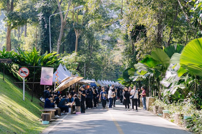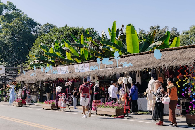 4. ถนนคนเดินดอยตุง รวมงานหัตถกรรมเสื้อผ้า กระเป๋าทอมือ อาหารพื้นถิ่น และเมนูพิเศษ เช่น พิซซ่าหมูดำ ข้าวซอย น้ำเงี้ยว น้ำพริกหนุ่ม รวมถึงไอศกรีม Soft Serve จากวัตถุดิบที่ปลูกบนดอยตุง