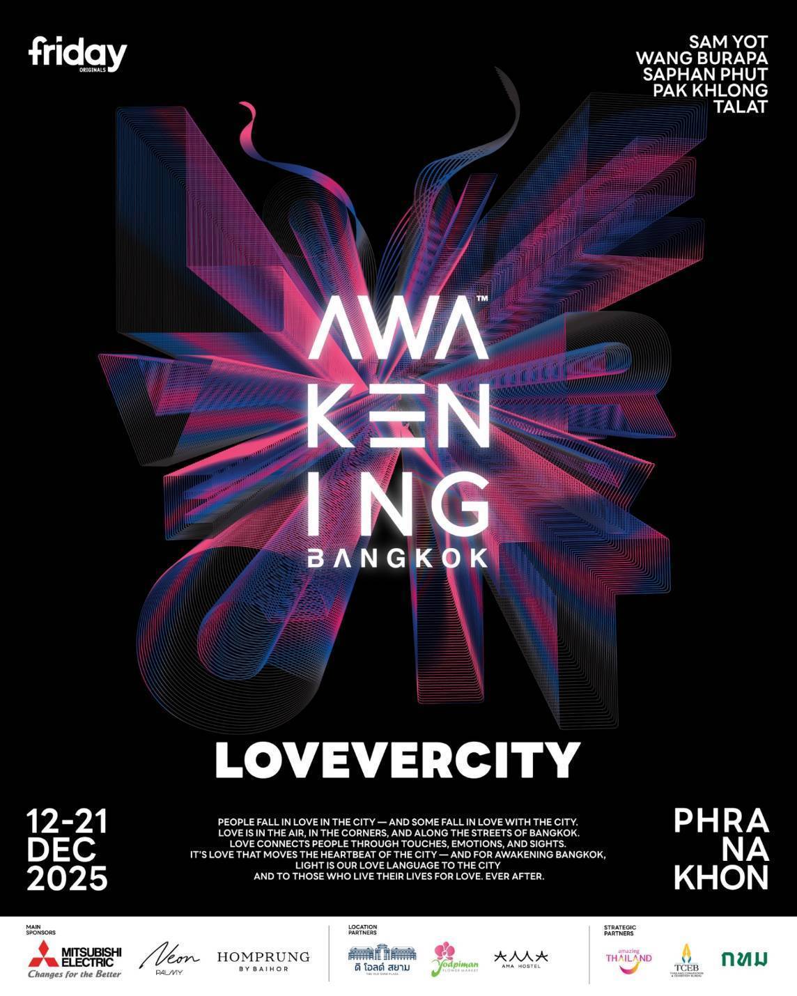 เทศกาลแสงไฟและศิลปะดิจิทัล “Awakening Bangkok 2025” กลับมาส่องแสงแห่งแรงบันดาลใจและความคิดสร้างสรรค์อีกครั้งอย่างยิ่งใหญ่ เป็นครั้งที่ 8 และเป็นครั้งที่ 3 ในย่านพระนคร ภายใต้ธีม “LOVEVERCITY” ถ่ายทอดแนวคิด “เมืองคือจุดเริ่มต้นของความรักในหลากหลายมิติ” ผ่านผลงานศิลปกรรมไฟและดิจิทัล 27 ชิ้นงาน ที่จะสว่างไสวทั่วทั้งเขตพระนคร พื้นที่ประวัติศาสตร์ใจกลางกรุงเทพฯ ระหว่างวันที่ 12–21 ธันวาคม 2568