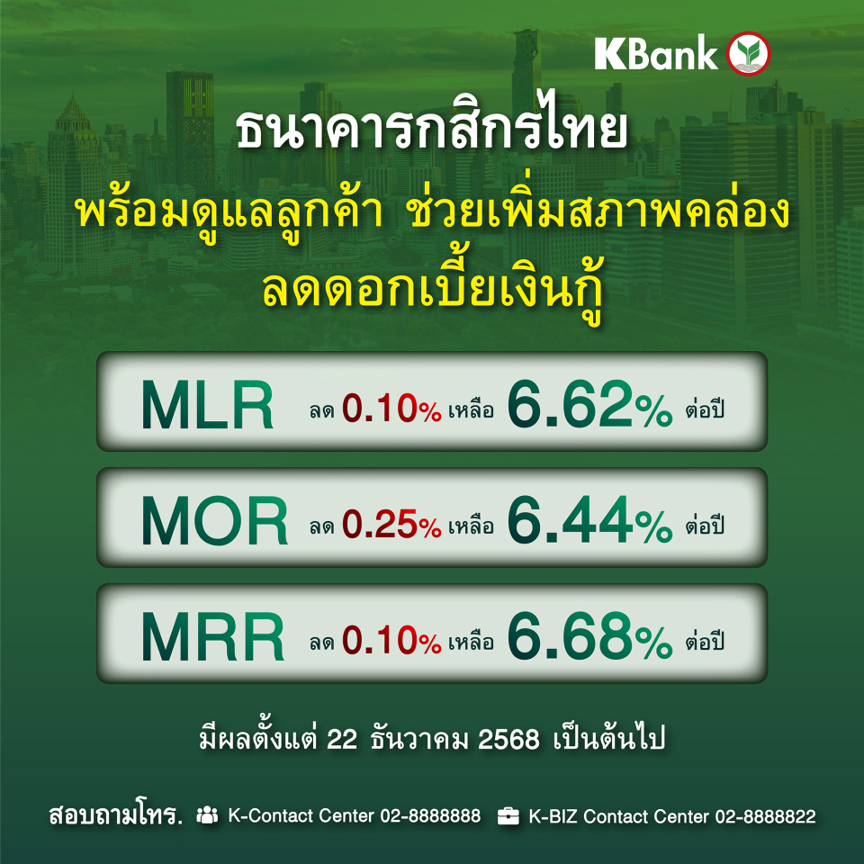 นายจงรัก รัตนเพียร ผู้จัดการใหญ่ ธนาคารกสิกรไทย เปิดเผยว่า เศรษฐกิจไทยในระยะข้างหน้ามีแนวโน้มขยายตัวได้ในกรอบจำกัด จากแรงกดดันด้านการบริโภคและการส่งออกที่ชะลอตัว ภาคเอกชนที่ชะลอการใช้จ่ายและการลงทุนจากภาวะที่มีความไม่แน่นอนสูง ธนาคารเชื่อมั่นว่า การดำเนินมาตรการเชิงรุกด้วยการตัดสินใจปรับลดอัตราดอกเบี้ยโดยทันที ถือเป็นก้าวสำคัญในการเสริมสร้างเสถียรภาพทางการเงินและสนับสนุนประสิทธิผลของนโยบายการเงินในภาพรวม โดยเฉพาะอย่างยิ่งการเร่งช่วยเหลือและดูแลลูกค้าของธนาคาร เพื่อให้ประเทศสามารถฟื้นตัวและเติบโตได้อย่างเต็มศักยภาพ อันจะนำไปสู่ความยั่งยืนทางเศรษฐกิจในระยะยาว