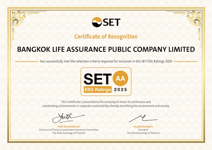 บริษัท กรุงเทพประกันชีวิต จำกัด (มหาชน) ได้รับคัดเลือกให้อยู่ในรายชื่อหุ้นยั่งยืน “SET ESG Ratings” ต่อเนื่องเป็นปีที่ 5 โดยในปี 2568 ได้รับผลการประเมินในระดับ AA จากตลาดหลักทรัพย์แห่งประเทศไทย โดยเป็นหนึ่งในบริษัทจดทะเบียน 265 แห่ง ที่ได้รับการประกาศผลประเมินหุ้นยั่งยืน SET ESG Ratings รวมถึงยังได้รับผลการประเมินจากการสำรวจการกำกับดูแลกิจการบริษัทจดทะเบียนไทย (Corporate Governance Report of Thai Listed Companies - CGR) ปี 2568 ในระดับ 5 ดาว หรือ “ดีเลิศ” (Excellent CG Scoring) ต่อเนื่องเป็นปีที่ 3