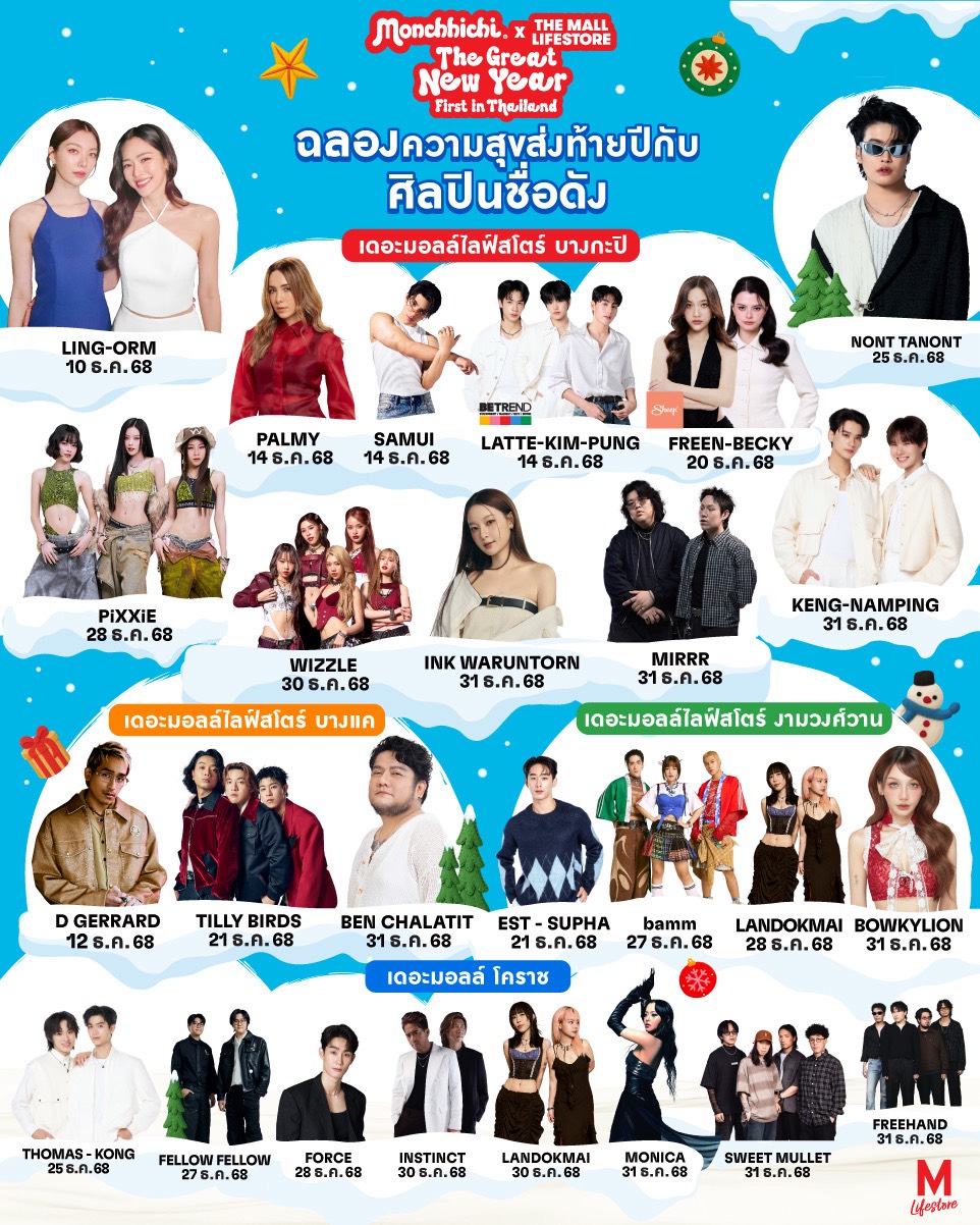 สัมผัสบรรยากาศเฟสทีฟสุดอบอุ่น กับ MONCHHICHI CHRISTMAS TOWN พบความน่ารักแสนซนของ “มอนชิชิ ที่จะมาเติมสีสันและรอยยิ้ม พร้อมเติมเต็มบรรยากาศแห่งการเฉลิมฉลองด้วยเหล่าศิลปินชื่อดังกว่า 100 ชีวิต ที่มาร่วมสร้างความสุขให้เหล่าแฟนคลับทุก Gen อย่างใกล้ชิด ผ่านมินิคอนเสิร์ตสุดมันส์ ที่จัดขึ้นทั่วทุกมุมเมืองของศูนย์การค้าเดอะมอลล์ไลฟ์สโตร์ ทุกสาขา อาทิ
