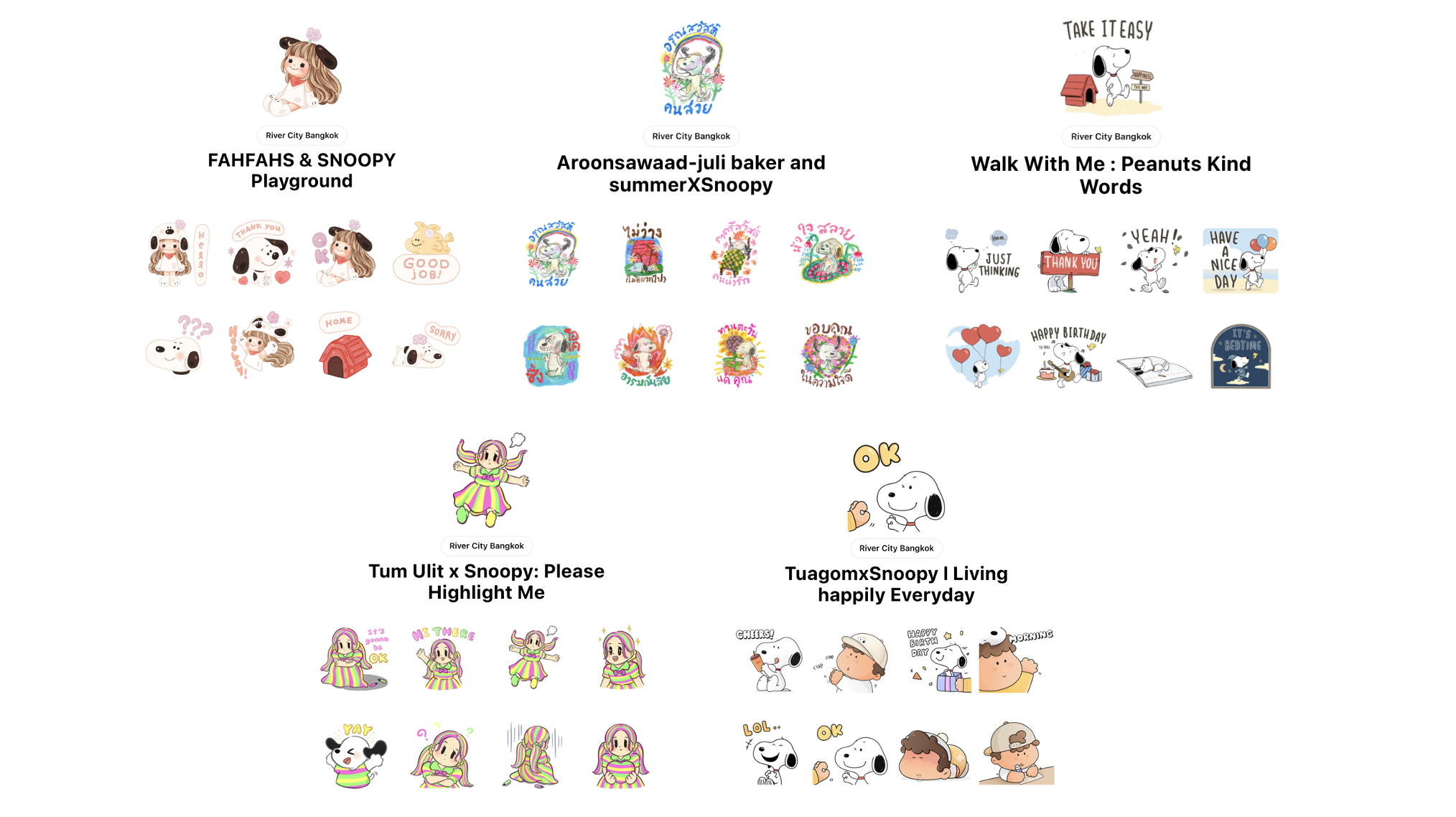 คอลเลกชัน LINE STICKERS พิเศษในโปรเจกต์ “How Do You Do, Snoopy? 75 Years: A Journey of Friendship Through Art” เป็นการนำเสนอคาแรกเตอร์ Snoopy ในมุมมองใหม่ผ่านลายเส้นอันเป็นเอกลักษณ์ของ 5 ศิลปินไทยชื่อดัง ได้แก่ FAHFAHS เจ้าของคาแรกเตอร์เด็กผู้หญิงตาโตในโทนสีพาสเทลอ่อนโยนสุดอบอุ่น, Tum Ulit ศิลปินผู้ถ่ายทอดสไตล์ผลงานที่น่ารัก เรียบง่าย ในรูปแบบสีหม่นๆ สื่อถึงความเหงาและความเปราะบาง, Juli Baker and Summer กับงานเพนต์ลายเส้นอิสระที่โดดเด่นด้านการใช้สีสันสดใสเต็มไปด้วยพลังบวก, Tuagomstudio เจ้าของคาแรกเตอร์ "ตัวกลม" ที่ดูเป็นมิตรกับทุกคน และ Munins ผู้ถ่ายทอดความนุ่มละมุนในสไตล์มินิมัลที่ลึกซึ้งกินใจ