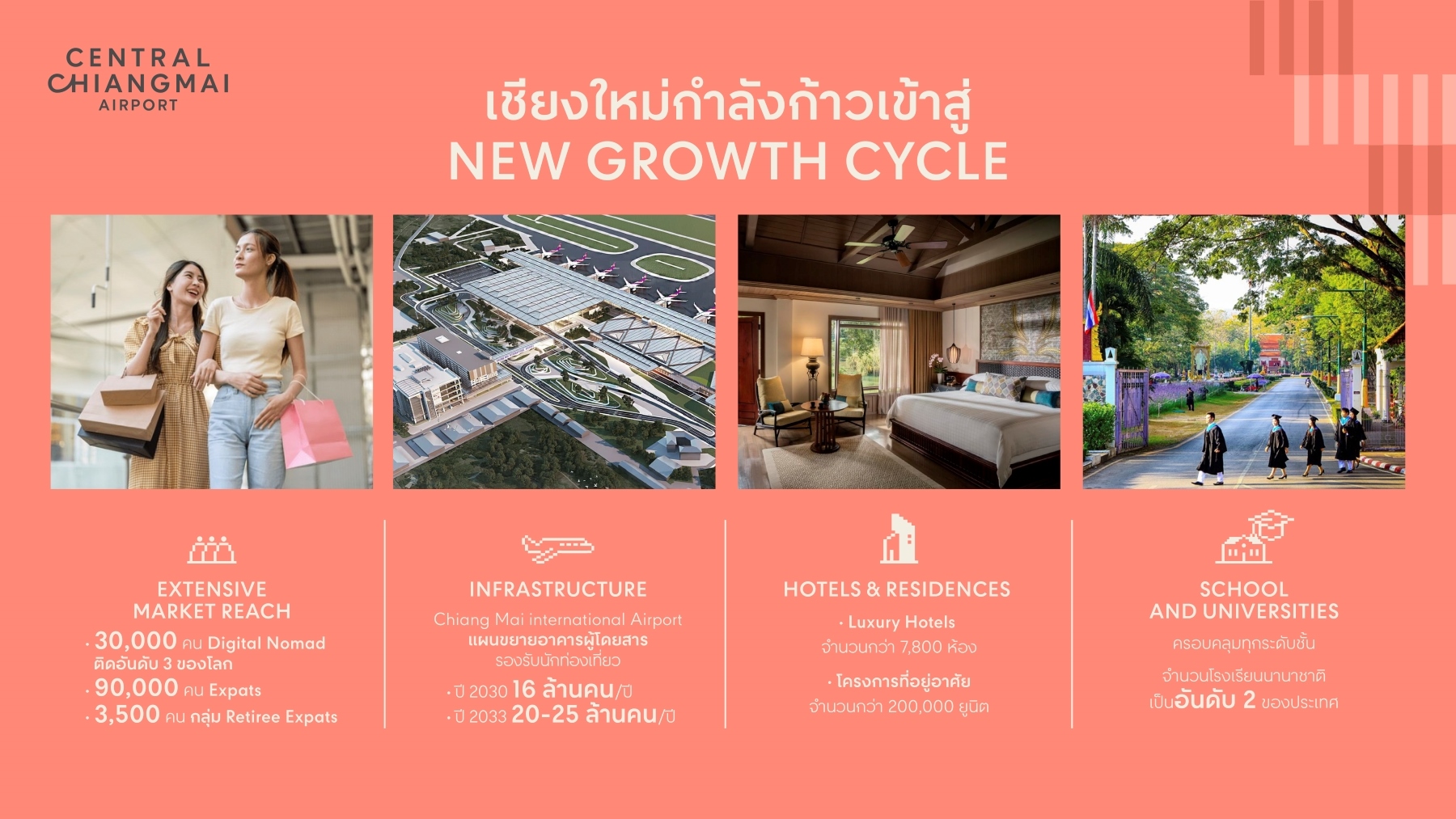“เซ็นทรัล เชียงใหม่ แอร์พอร์ต อยู่คู่เชียงใหม่มา 30 ปี ตั้งอยู่พื้นที่ทางทิศใต้ใกล้ตัวเมือง รวมทั้งย่านธุรกิจ, โรงพยาบาล, โครงการที่พักอาศัยกว่า 150 แห่ง ส่วนใหญ่เป็นหมู่บ้านขนาดใหญ่ที่มีมานาน, สถาบันการศึกษา และเดินทางเพียง 3 นาที จากสนามบินนานาชาติเชียงใหม่ อีกทั้ง ยังใกล้พื้นที่อำเภอหางดง และสารภี ซึ่งเป็นชุมชนงานคราฟต์ มีความเป็น Local Touch เมื่อ Landscape เมืองเปลี่ยน มีการขยายตัวออกไปต่อเนื่อง จากศูนย์กลางสู่พื้นที่รอบนอก ทำให้ Catchment ของเมืองโตขึ้น มีความ Sophisticated ขึ้น ทั้งในด้านรายได้ และไลฟ์สไตล์ การทรานส์ฟอร์มเซ็นทรัล เชียงใหม่ แอร์พอร์ต จึงเป็นการตอบโจทย์ดีมานด์ใหม่ของเมืองและยกระดับสู่การเป็นแลนด์มาร์กมิกซ์ยูสแห่งใหม่ของเมือง ทำให้ดึงดูดนักท่องเที่ยวทั้งชาวไทยและต่างชาติ โดยปี 2568 มีทราฟฟิกกว่า 13 ล้านคนต่อปี เฉลี่ย 38,000 คน/วัน คาดปี 2569 เพิ่มเป็น 42,000 คน/วัน ในขณะที่เซ็นทรัล เชียงใหม่ ทำหน้าที่รองรับการขยายตัวของเมืองฝั่งเหนือ”