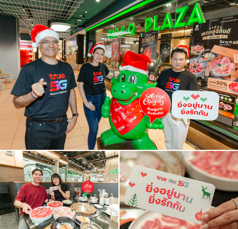 เพราะมื้ออาหารคือช่วงเวลาแห่งความสุขร่วมกัน... ทรู คอร์ปอเรชั่น เดินหน้าสร้างรอยยิ้ม และความประทับใจ เนรมิตบรรยากาศวันคริสต์มาสอีฟให้เต็มไปด้วยความสุขและเสียงหัวเราะ ในกิจกรรม “อัพสัญญาณความสุข อิ่มฟรีรับปีใหม่ @ บาร์บีคิวพลาซ่า” มอบของขวัญสุดพิเศษ “สุขด้วยกันวันคริสต์มาสอีฟ 24 ธันวาคม” ให้ลูกค้าคนสำคัญอิ่มอร่อยกับมื้อพิเศษที่ บาร์บีคิวพลาซ่า ฟรีพร้อมกันทั่วประเทศ เพื่อตอกย้ำความผูกพันผ่านมื้ออาหารที่คัดสรรมาแทนคำขอบคุณลูกค้าจากใจจริง สานต่อแคมเปญ “ยิ่งอยู่นาน ยิ่งรักกัน” พร้อมเซอร์ไพรส์จากทีมผู้บริหาร ทรู คอร์ปอเรชั่น นำโดย ชารัด เมห์โรทรา หัวหน้าคณะผู้บริหารด้านกลุ่มธุรกิจลูกค้าบุคคล, โอลิเวอร์ กิตติพงษ์ วีระเตชะ หัวหน้าคณะผู้บริหารด้านแบรนด์และมีเดีย, สรรค์พิจิตร เอี่ยมชีรางกูร หัวหน้าสายงานบริหารความสัมพันธ์และผสานสิทธิประโยชน์ลูกค้า ลงพื้นที่มาต้อนรับและขอบคุณลูกค้าคนสำคัญที่อยู่กับทรูด้วยกันมายาวนาน