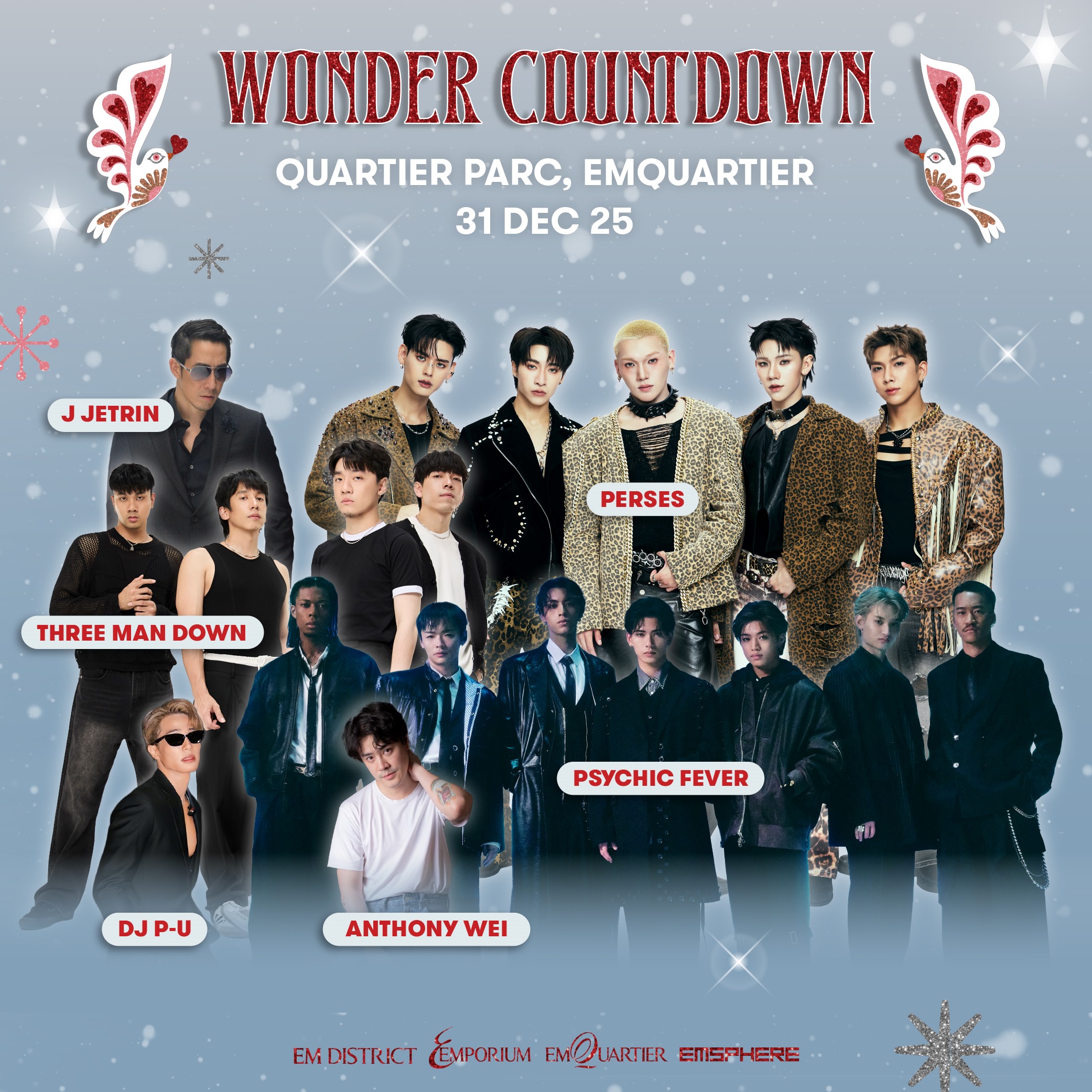 นอกจากนั้น ยังยกทัพศิลปินชื่อดังแถวหน้าของเมืองไทยร่วมสร้างสีสันและความสนุกแบบนัน-สต็อป ร่วมเคาท์ดาวน์นับถอยหลังสู่ปีใหม่ 2026 ในบรรยากาศสุดอลังการ กับการแสดงคอนเสิร์ต แสง สี เสียง สุดตระการตาที่จะร่วมมอบความประทับใจให้ทุกคนส่งท้ายปี สร้างแลนด์มาร์กแห่งความสุขใจกลางถนนสุขุมวิท ด้วยกิจกรรม WONDER COUNTDOWN สนุก สุดมันส์กับการแสดงจากศิลปินชั้นนำของเมืองไทยและต่างประเทศ ได้แก่ เจ เจตริน, บุรินทร์, TREE MAN DOWN, PERSES ศิลปิน J-POP PSYCHIC FEVER,ANTHONY WEI และดีเจชั้นนำ, DJ P-U ที่ QUARTIER PARC ศูนย์การค้าเอ็มควอเทียร์ ในค่ำคืนเคาน์ดาวน์ส่งท้ายปีเก่า 31 ธันวาคม 2568 ก่อนร่วมกันนับถอยหลังพร้อมกันสู่ปี 2026 อย่างยิ่งใหญ่