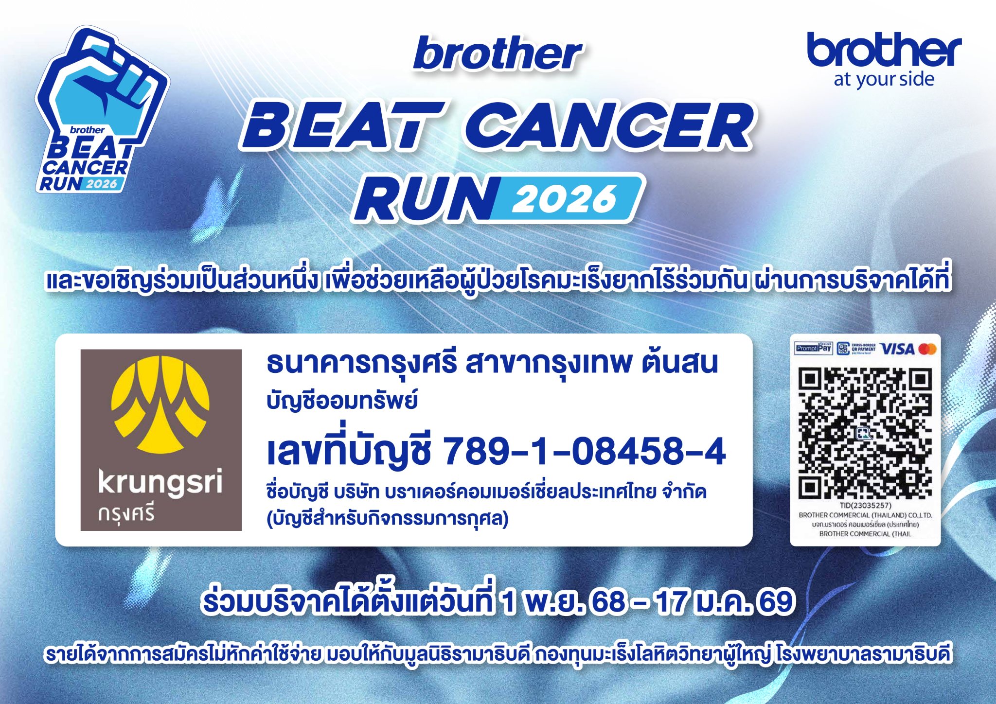 Brother ผู้นำโซลูชันด้านการพิมพ์จากประเทศญี่ปุ่น เดินหน้าสร้างแรงบันดาลใจผ่านแคมเปญวิ่งการกุศลประจำปี “Brother Beat Cancer Run 2026” ที่มีพันธกิจมุ่งเน้นการระดมทุนไปจัดซื้อยาและสนับสนุนการรักษาผู้ป่วยโรคมะเร็งที่ขาดแคลนทุนทรัพย์ในการรักษาผ่านมูลนิธิรามาธิบดีฯ ล่าสุดเชิญชวนนักวิ่งและผู้มีใจกุศลทั่วประเทศมาร่วมกันสร้างประวัติศาสตร์แห่งการแบ่งปันที่ยิ่งใหญ่กว่าเดิม หลังปีที่ผ่านมาที่มีผู้เข้าร่วมวิ่งสูงสุดตั้งแต่จัดกิจกรรมกว่า 2,000 คน และสามารถรวบรวมเงินบริจาคโดยไม่หักค่าใช้จ่ายได้สูงถึง 1.6 ล้านบาท