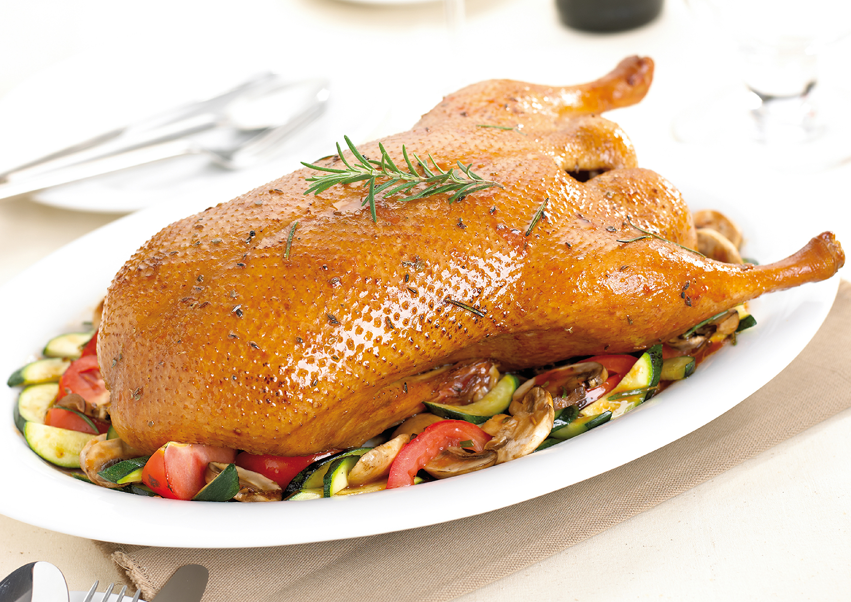 เริ่มต้นเมนูแรกด้วย เป็ดย่างเต็มตัวพร้อมน้ำราด (Roasted Duck) เมนูเป็ดพร้อมปรุงที่แช่แข็ง มาพร้อมน้ำราดรสชาติเข้มข้นที่แสนอร่อย เนื้อเป็ดย่างหอมนุ่ม ผ่านการปรุงรสอย่างพิถีพิถัน อร่อย ได้อย่างง่ายๆ สะดวก พร้อมปรุงเพื่อเป็นเมนูไฮไลท์สำหรับงานเลี้ยงสังสรรค์ โดยเพียงนำถุงเป็ด ออกจากช่องแช่แข็ง ปล่อยให้ละลายในช่องแช่เย็นธรรมดา ก็สามารถนำมาอุ่นแล้วรับประทานได้เลย