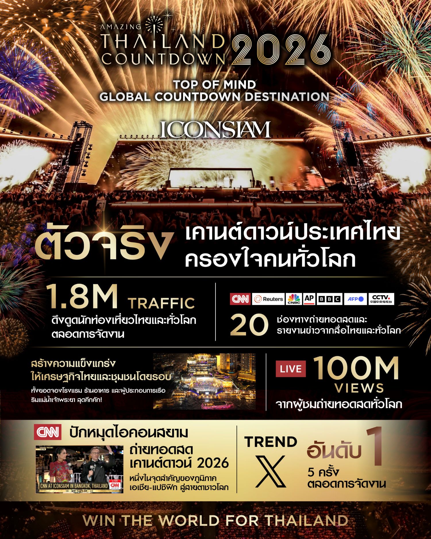 งาน Amazing Thailand Countdown 2026 ณ ไอคอนสยาม เป็นศูนย์กลางเฉลิมฉลองส่งท้ายปีที่ดึงดูดชาวไทยและนักท่องเที่ยวจากนานาประเทศ มากกว่า 1.8 ล้านคน พร้อมสร้างการรับชมถ่ายทอดสดและคอนเทนต์ที่เกี่ยวข้องจากทั่วโลกหลายร้อยล้านวิว ผ่านสื่อระดับนานาชาติและแพลตฟอร์มดิจิทัล ขณะที่กระแสบนโซเชียลมีเดียพุ่งขึ้นติด อันดับ 1 เทรนด์บนแพลตฟอร์ม X และอีกหลายแพลตฟอร์ม ตอกย้ำสถานะของไอคอนสยามในฐานะ Global Experiential Destination ในทุกเทศกาลของประเทศไทยอย่างแท้จริง