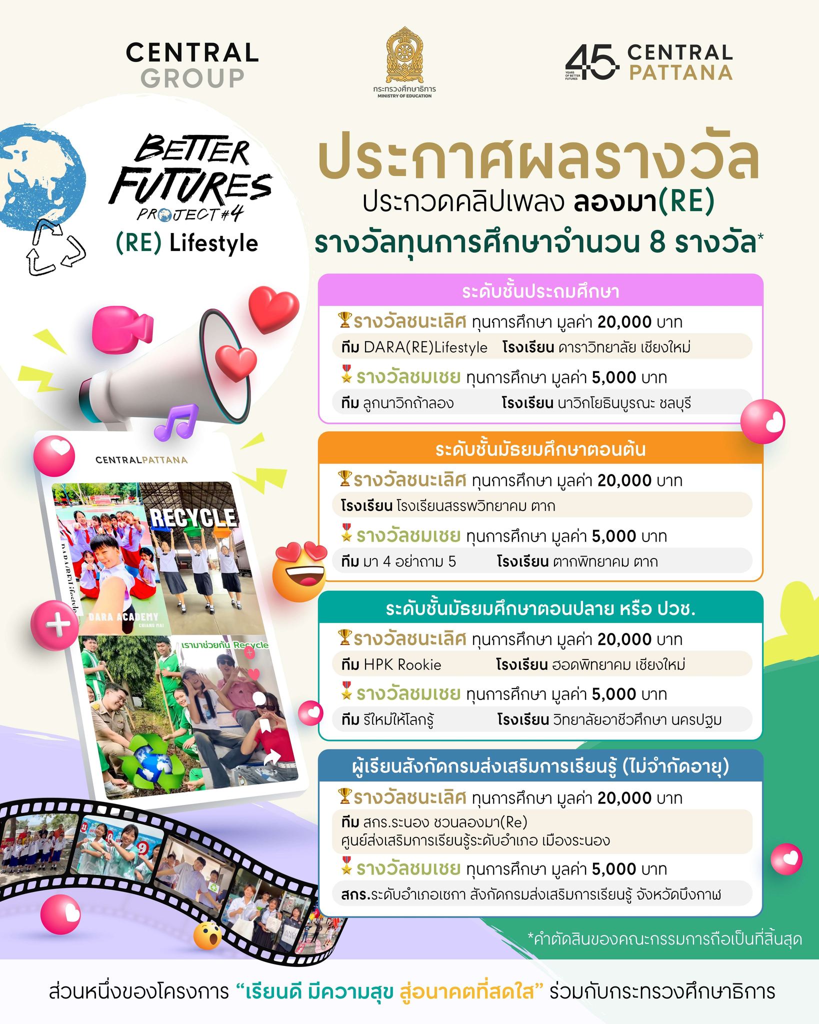 เนื่องในวันเด็กแห่งชาติ เซ็นทรัลพัฒนา ประกาศความสำเร็จจากความร่วมมือภายใต้บันทึกข้อตกลงความร่วมมือการส่งเสริมศักยภาพนักเรียน นักศึกษาระหว่างกระทรวงศึกษาธิการ บริษัท เซ็นทรัลพัฒนา จำกัด (มหาชน) และกลุ่มบริษัทเซ็นทรัล เพื่อตอบสนองนโยบาย “เรียนดี มีความสุข” สร้างระบบนิเวศทางการศึกษา ผ่านความร่วมมือระหว่างกระทรวง ครูผู้สอน บุคลากรทางการศึกษา ผู้ปกครอง ชุมชน และผู้ประกอบการ อีกทั้งเปิดโอกาสให้นักเรียนได้เรียนรู้ ผ่านการลงมือทำจริง ตามแนวทางการขับเคลื่อนเพื่อความยั่งยืน- เซ็นทรัล ทำ ของกลุ่มเซ็นทรัล จัดพิธีมอบประกาศนียบัตรและทุนการศึกษาใน “คลิปสั้นประกอบเพลง ‘ลองมา(RE)’ ภายใต้โครงการ “เรียนดี มีความสุข สู่อนาคตที่สดใส” ระหว่างกระทรวงศึกษาฯและเซ็นทรัลพัฒนา รวม 8 รางวัล และ 2 รางวัลพิเศษ จากผลงานของนักเรียนกว่า 120 ทีมทุกภูมิภาค ณ ศูนย์การค้าเซ็นทรัล ทั่วประเทศ