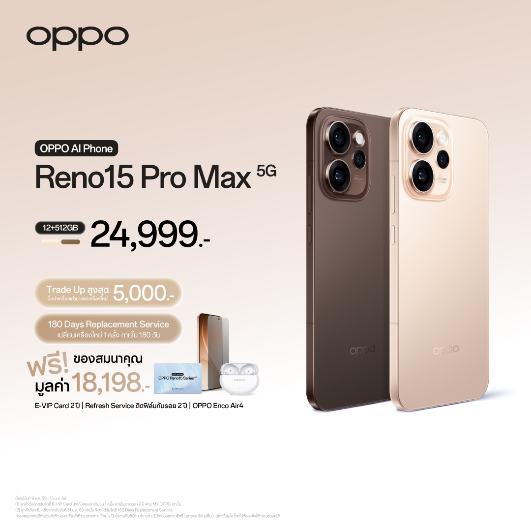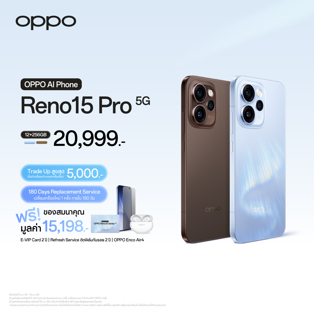ชวนสัมผัส OPPO Reno15 Series 5G สมาร์ตโฟนเพื่อนซี้ เทรนดี้ทุกช็อต พร้อมกับ OPPO Watch S และ OPPO Pad 5 รุ่นใหม่ ได้แล้ววันนี้ ณ OPPO Brand Shop ทุกสาขา และตัวแทนจำหน่ายทั่วประเทศ
