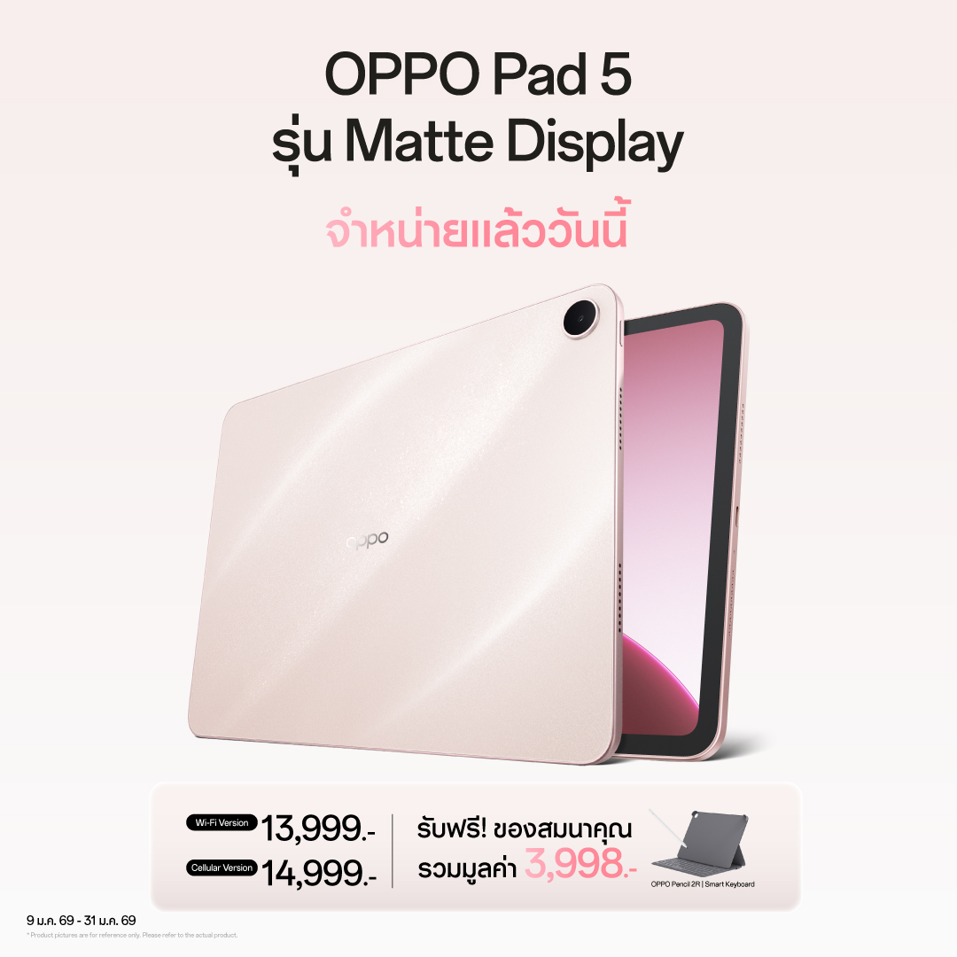จับคู่มากับ OPPO Pad 5 แท็บเล็ตรุ่นใหม่หน้าจอ 12.1 นิ้ว 2.8K แบบ Anti-Glare Soft Light ถนอมสายตาและ Pastel Mode ให้อารมณ์เหมือนอ่านบนกระดาษ รองรับปากกา Stylus ความหน่วงต่ำตอบสนองแรงกดหลายระดับเขียนลื่นเป็นธรรมชาติเพื่อการจดเลกเชอร์และสร้างสรรค์ผลงาน ขับเคลื่อนด้วย ColorOS for Pad ที่มอบประสบการณ์ Smart & Smooth ที่สุด มี Flux Themes ปรับแต่งได้ 5 แบบ วิดเจ็ตล็อกสกรีนได้ถึง 6 ช่อง และ AI Image-to-Text (ภาษาอังกฤษเท่านั้น) เสริมประสิทธิภาพด้วยระบบจัดการหน้าจออัจฉริยะ Flux Home Screen, Fluid Cloud รวมถึง Split-Screen และ Floating Window พร้อมลำโพง Quad Speaker เสียงคมชัด ใช้งานยาวนานด้วยแบตเตอรี่ 10050mAh พร้อมเชื่อมต่อไร้รอยต่อแบบ Cross-ecosystem ร่วมกับ Apple, Android และ Windows ได้ทุกที่ทุกเวลา วางจำหน่ายในราคาเริ่มต้น 13,999 บาท