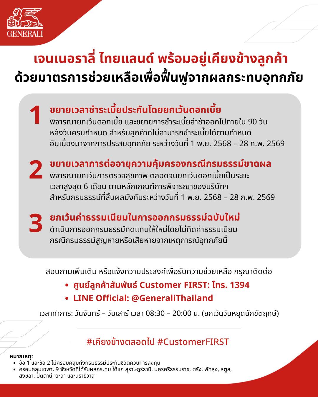 พร้อมร่วมวางมาตรการช่วยเหลือด้านกรมธรรม์เพื่อลดภาระทางการเงินให้แก่ลูกค้า อาทิ การขยายเวลาชำระเบี้ยประกันโดยยกเว้นดอกเบี้ย การขยายระยะเวลาการต่ออายุความคุ้มครองในกรณีกรมธรรม์ขาดผลบังคับ ระหว่างวันที่ 1 พ.ย. 2568 – 28 ก.พ.2569 รวมถึงการยกเว้นค่าธรรมเนียมในการออกกรมธรรม์ฉบับใหม่* ควบคู่กับการส่งมอบสิ่งของจำเป็นและชุดยังชีพเพื่อบรรเทาความเดือดร้อนในเบื้องต้น