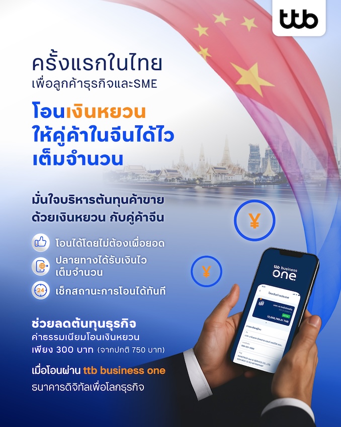 1. บริการโอนเงินไปต่างประเทศ ทีทีบี ครั้งแรกในไทยที่ธุรกิจโอนเงินหยวนให้คู่ค้าในจีนได้ไว เต็มจำนวนครบทุกหยวน ไม่มีหักปลายทาง ไม่ต้องเผื่อยอดโอน เมื่อโอนเงินสกุลหยวนไปจีนผ่านช่องทาง ttb business one ค่าธรรมเนียมการโอนเพียง 350 (จากปกติ 750 บาท)