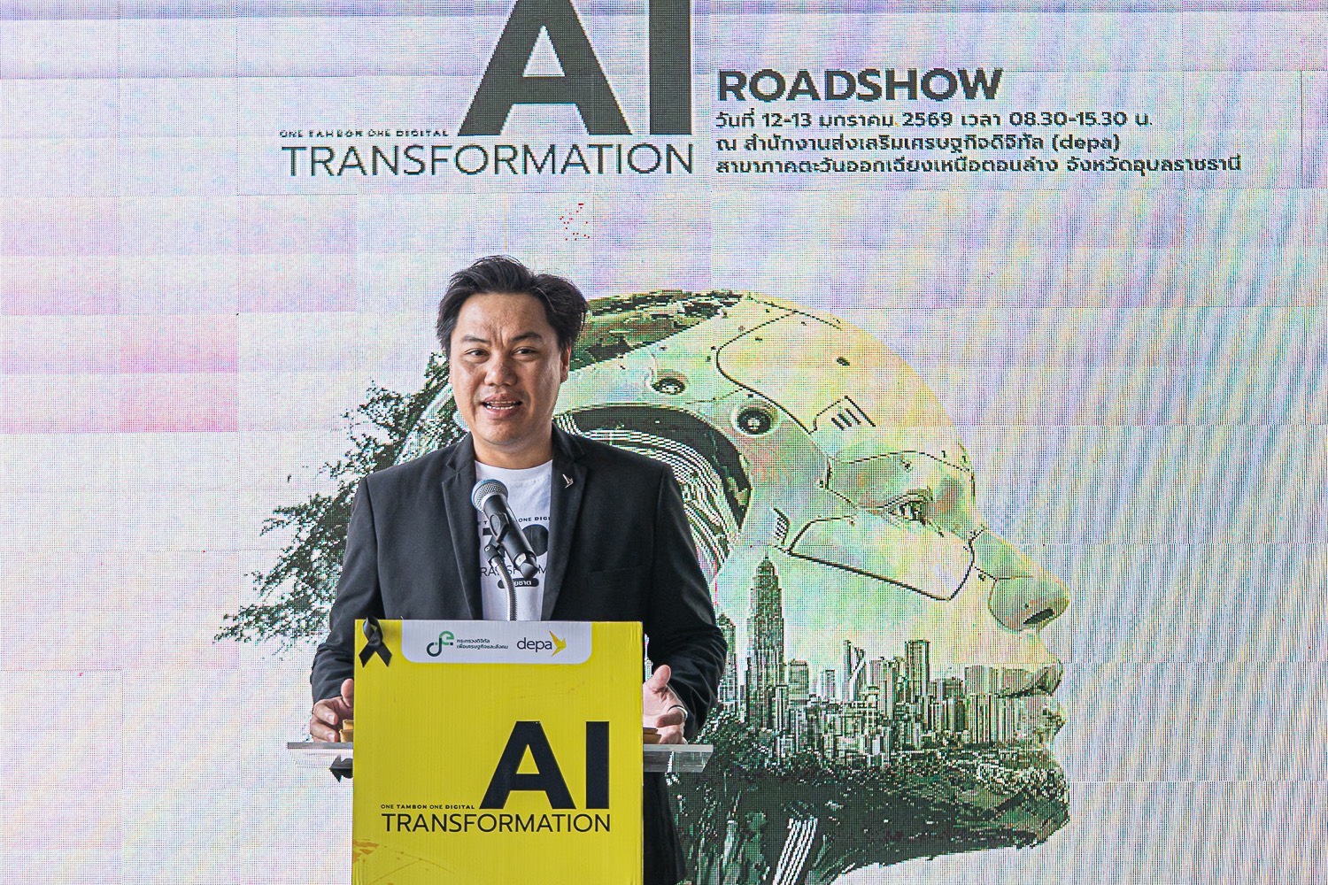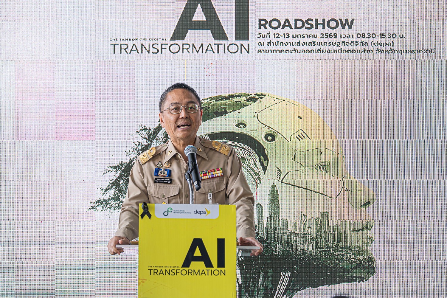 ร้อยตรีสรมงคล มงคละสิริ รองผู้ว่าราชการจังหวัดอุบลราชธานี ให้เกียรติเป็นประธานเปิดกิจกรรม AI Transformation Roadshow ครั้งที่ 6 จังหวัดอุบลราชธานี กิจกรรมกระตุ้นการประยุกต์ใช้เทคโนโลยีและนวัตกรรมดิจิทัลในโครงการ AI Transformation โดยมี พรชัย หอมชื่น ผู้ช่วยผู้อำนวยการใหญ่ กลุ่มงานกิจการสาขา สำนักงานส่งเสริมเศรษฐกิจดิจิทัล (depa) พร้อมด้วย รัฐพล นพวงศ์ ณ อยุธยา ปฏิบัติหน้าที่แทนผู้จัดการสาขาภาคอีสานตอนล่าง สำนักงานส่งเสริมเศรษฐกิจดิจิทัล (depa) รวมถึงผู้บริหารและผู้แทนจากหน่วยงานภาครัฐ ภาคเอกชน ผู้ประกอบการ SMEs ภาคการผลิต การค้าและบริการ กลุ่มเกษตรแปรรูป ผู้ประกอบการรายย่อย เกษตรกร ร่วมงานโดยพร้อมเพรียง ณ อาคาร ดีป้า สาขาภาคอีสานตอนล่าง