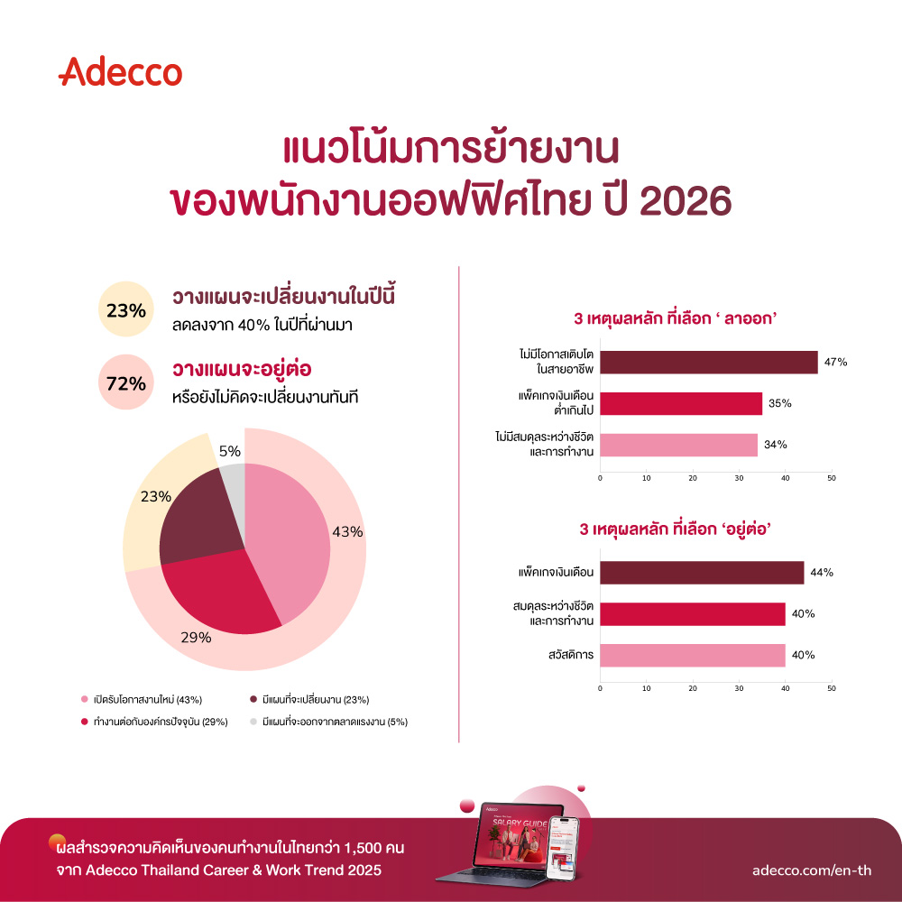 ผลสำรวจ Thailand Career & Work Trend 2025-2026 พบว่า 72% ของคนทำงานยังไม่มีแผนเปลี่ยนงานใน 12 เดือนข้างหน้า มีเพียง 23% ที่บอกว่ากำลังหางานใหม่อย่างจริงจัง ซึ่งลดลงอย่างมีนัยสำคัญจากปี 2567 ที่มีผู้มองหางานใหม่ถึง 40% สะท้อนความระมัดระวังและความต้องการความมั่นคงมากขึ้นในการทำงาน
