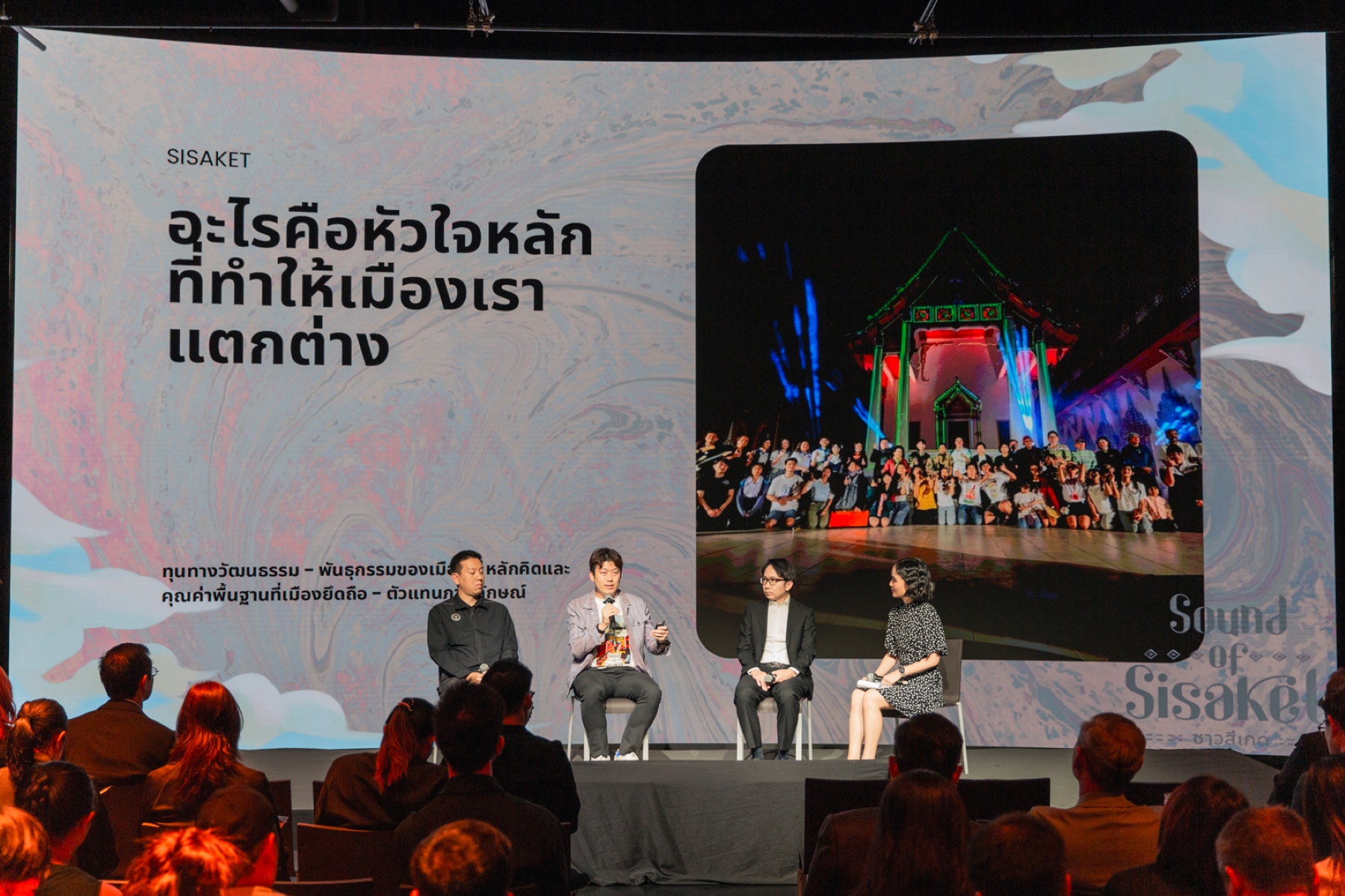 ช่วงที่ 2 ของการเสวนาเป็นการแลกเปลี่ยนในมิติของพื้นที่สร้างสรรค์ โดย คุณรัฐวิทย์ อังคสกุลเกียรติ ประธานหอการค้าจังหวัดศรีสะเกษ ฉายภาพการพัฒนาเมืองศรีสะเกษโดยใช้ความคิดสร้างสรรค์ผนวกกับทรัพย์สินทางวัฒนธรรมที่ดำเนินการมาอย่างต่อเนื่อง เช่น การปั้นแบรนด์ “ทุเรียนภูเขาไฟ” ให้มีชื่อเสียงและเป็นเอกลักษณ์เมือง การใช้วัฒนธรรมดนตรีอีสานเป็นฐานเพื่อจัดเทศกาลดนตรีดึงดูดผู้เข้าร่วมและรายได้เข้าสู่จังหวัด ล่าสุดศรีสะเกษยังเป็นแหล่งอุตสาหกรรมภาพยนตร์แห่งใหม่เมื่อ “จักรวาลไทบ้าน” สามารถสร้างกระแส “อีสานอินดี้” ขึ้นทั่วประเทศ และจะเป็นแหล่งงานที่สร้างอาชีพใหม่ให้กับชาวอีสาน