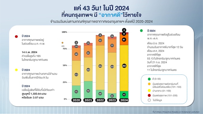 ข้อมูลคุณภาพอากาศในกรุงเทพฯ ปี พ.ศ. 2567 จาก สำนักข่าว Thai PBS ระบุว่า ตลอดทั้งปี คนกรุงเทพฯ มีวันที่อากาศ “ดีจริง ๆ” เพียง 43 วันเท่านั้น! ส่วนใหญ่จะอยู่ในช่วงหน้าฝนระหว่างเดือนพฤษภาคมถึงตุลาคม ถือว่าเป็นช่วงที่หายใจได้ สบายใจที่สุด นอกนั้นอยู่ในกลุ่มคุณภาพอากาศระดับปานกลาง แต่เราต้องระวังเป็นพิเศษในช่วงเดือนมกราคมถึงกุมภาพันธ์ หรือช่วงที่ความกดอากาศต่ำมาก ๆ ซึ่งค่าฝุ่นพิษพุ่งสูงจนแตะระดับ 165 ไมโครกรัมต่อลูกบาศก์เมตร สิ่งนี้สะท้อนให้เห็นว่ามลพิษทางอากาศไม่ใช่เรื่องไกลตัวอีกต่อไป