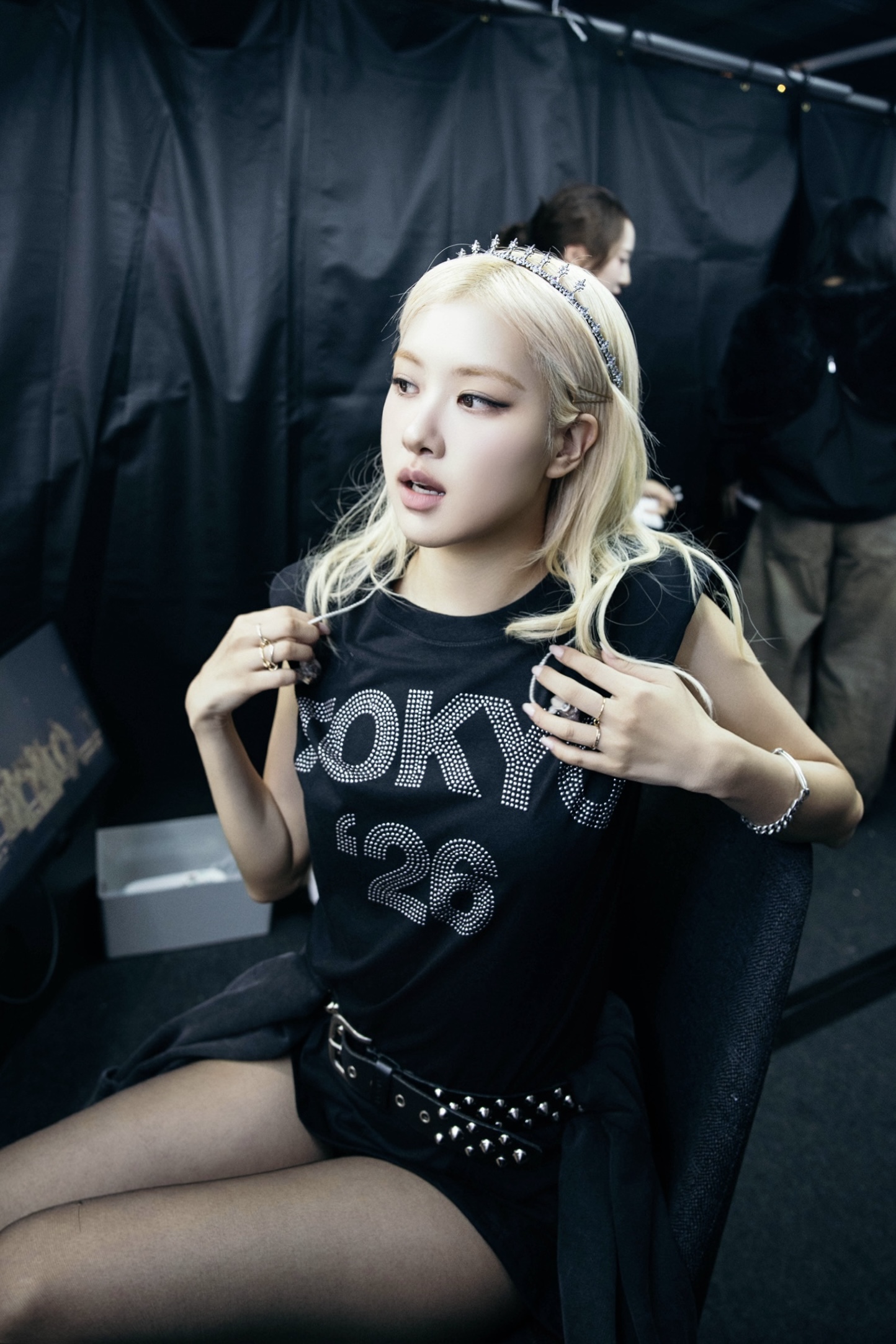 สำหรับคืนสุดท้ายของการแสดงที่โตเกียว Rosé สวมเสื้อยืดวินเทจลายอินทรีของ Levi’s® ที่นำมาตัดเย็บใหม่เป็นท็อปแบบเกาะอก พร้อมสายเข็มขัดผ้าเดนิมประดับหมุดสะกดคำว่า “Tokyo 26” ทีละตัวด้วยมือ จับคู่กับกระโปรงมินิสเกิร์ตหนังลายทางสีฟ้าและเงิน ซึ่งเป็นชิ้นพิเศษเพียงหนึ่งเดียว ถูกออกแบบด้วยเทคนิคการผลิตล้ำสมัย และเสริมลุคด้วยแจ็กเก็ตทรักเกอร์เดนิมสีดำตัวเดิมจากคืนที่สอง