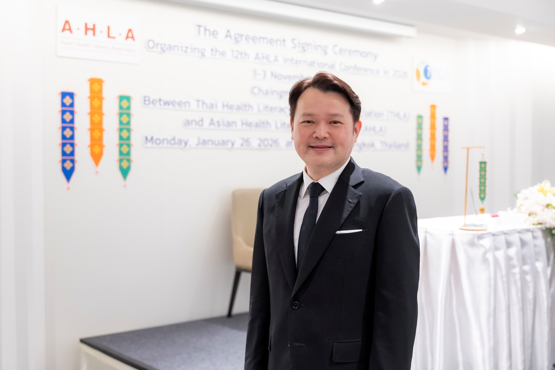 ทศพร นิษฐานนท์ (ที่ 5 จากซ้าย) กรรมการผู้จัดการ บริษัท แอมเวย์ (ประเทศไทย) จำกัด ร่วมสนับสนุนการประชุมระดับนานาชาติ ว่าด้วยความรอบรู้ด้านสุขภาพ AHLA ครั้งที่ 12 ในพิธีลงนามบันทึกข้อตกลงความร่วมมือระหว่างสมาคมความรอบรู้ด้านสุขภาพแห่งเอเชีย (AHLA) และสมาคมส่งเสริมความรอบรู้ด้านสุขภาพไทย (THLA) เพื่อเตรียมความพร้อมในการจัดการประชุมวิชาการนานาชาติ ครั้งที่ 12 ประจำปี 2026 (The 12th AHLA International Health Literacy Conference) โดยมีเป้าหมายเป็นเวทีแลกเปลี่ยนองค์ความรู้ งานวิจัย และแนวปฏิบัติด้านสุขภาพจากผู้เชี่ยวชาญทั้งในและต่างประเทศ เพื่อร่วมกันยกระดับความรอบรู้ด้านสุขภาพ และขับเคลื่อนสุขภาวะที่ยั่งยืนของสังคมไทยและภูมิภาค ภายใต้ธีมหลัก “ความรอบรู้ด้านสุขภาพและเป้าหมายการพัฒนาที่ยั่งยืน” (Health Literacy & SDGs) ซึ่งจะจัดขึ้นระหว่างวันที่ 1 - 3 พฤศจิกายน 2569 ณ ศูนย์ประชุมมหาวิทยาลัยเชียงใหม่ โดยมี นายแพทย์วชิระ เพ็งจันทร์ (กลาง) นายกสมาคมส่งเสริมความรอบรู้ด้านสุขภาพไทย (THLA) เป็นประธานในพิธี