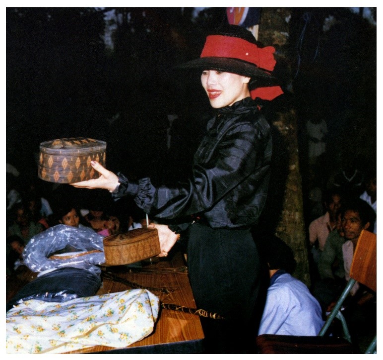 นางทากาโกะ คาโนมิ จากประเทศญี่ปุ่น ก็ให้ความสนใจในความงามของผ้าไหมมัดหมี่เป็นพิเศษ จัดงานแสดงชุดกิโมโนตัดเย็บจากผ้าไหมมัดหมี่ในกรุงโตเกียวและเกียวโต พร้อมขอพระราชทานให้ข้าราชบริพารไปแสดงแบบเสื้อผ้าในงาน เพื่อให้ชาวญี่ปุ่นและชาวต่างชาติได้เห็นว่า ผ้าไหมมัดหมี่สามารถตัดเย็บเป็นเสื้อผ้าตามสมัยนิยมได้อย่างงดงาม