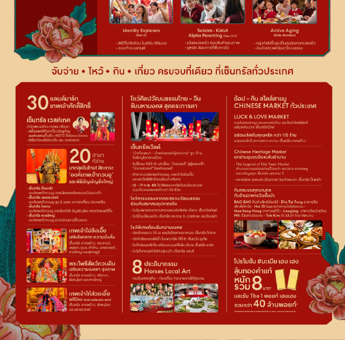 สร้างไทย-จีนคอมมูนิตี้ ที่รวมสินค้าไลฟ์สไตล์ อาหาร วัฒนธรรม ผสานกับความเชื่อ อาทิ LUCK & LOVE MARKET เซ็นทรัลเวิลด์ รวมไอเทมสายมู ของตกแต่งบ้าน และสินค้าไลฟ์สไตล์ เสริมพลังบวก ที่โซน Beacon 2, เซ็นทรัล ลาดพร้าว อร่อยเลิศกับคุณหรีด งานที่รวมอาหารทั้งของไหว้ ของท่านเล่น อาหารคาว - หวาน มากกว่า 115 ร้านค้า และChinese Heritage Market ยกตลาดจากย่านชุมชนจีนเก่าแก่ระดับตำนานมาไว้ศูนย์ฯ อาทิ เซ็นทรัล พระราม 3 The Legend of Old Town Market ตำนานความอร่อยย่านเมืองเก่า เยาวราช ตลาดพลู และเจริญกรุง และเซ็นทรัล ปิ่นเกล้า ถ่ายทอดเรื่องราวของตลาดน้อย ชุมชนชาวจีนริมแม่น้ำเจ้าพระยา “ตรุษจีนนี้ กินครบจบทุกมณฑล” อิ่มอร่อยกับร้านอาหารจีนชั้นนำภายในศูนย์การค้าทั่วประเทศ อาทิ BAO BAO ติ่มซำสไตล์เซี่ยงไฮ้, Din Tai Fung เน้นความพิถีพิถันสไตล์ไต้หวัน, Hai Di Lao หม่าล่าหม้อไฟสไตล์เสฉวน, Hua Seng Hong อาหารเหลาสไตล์แต้จิ๋ว, Longjing อาหารจีนสไตล์เจ้อเจียงจากหางโจว, MK เป็ดย่างสไตล์ฮ่องกง, Toh Kim ข้าวมันไก่สไตล์ไทย-ไหหนาน และอื่นๆอีกมากมาย พร้อมโปรโมชั่นสุดพิเศษ ลุ้นทองคำแท้ หนักรวม 8 บาท* และรับ The 1 พอยท์ เฮง เฮง รวมกว่า 40 ล้านพอยท์*