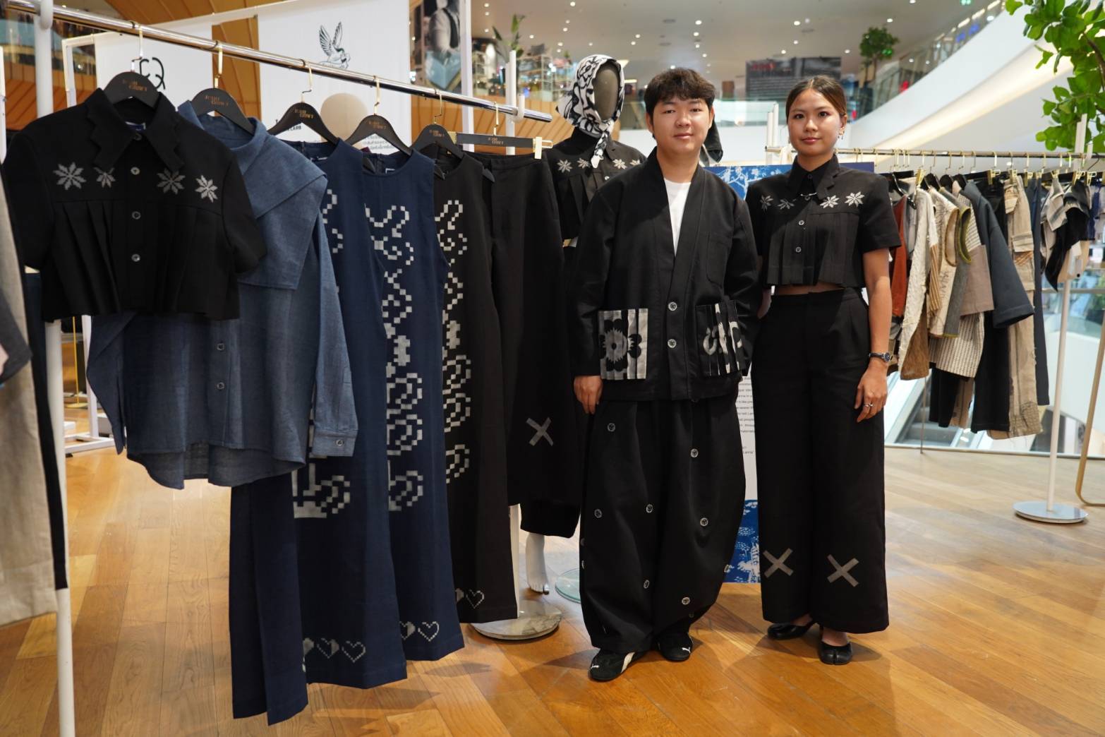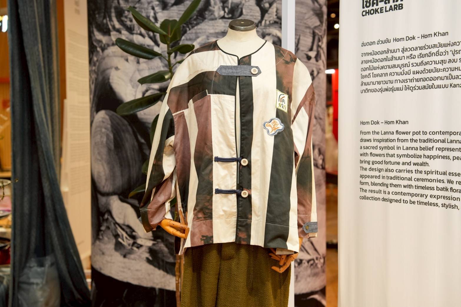 เริ่มจากแบรนด์แสนเก๋จากจังหวัดแพร่ “KANZ BY THAITOR” ที่สานต่อเทคนิคการทำผ้าบาติกจากรุ่นพ่อสู่รุ่นลูก นำมาออกแบบสร้างสรรค์เป็นเสื้อผ้าที่เรียบง่าย ร่วมสมัย สวมใส่ได้จริง พร้อมคำนึงถึงการใช้ได้ยาวนานและความยั่งยืน มีเอกลักษณ์ที่น่าสนใจคือการนำเศษผ้าเหลือใช้มาปะติดปะต่อเป็นผ้าชิ้นใหม่ เพื่อให้เกิดมิติของลาย จนเหมือนงานศิลปะที่สามารถสวมใส่ได้ โดย กานต์ศิริ พิทยะปรีชากุล นักออกแบบเจ้าของแบรนด์ เผยว่านิทรรศการครั้งนี้ KANZ BY THAITOR ตีความโชคลาภสู่คอลเลกชัน “Hom Dok - Hom Khan ฮ่มดอก ฮ่วมขัน” นำแรงบันดาลใจจากหม้อดอกล้านนา หรือ “ปูรณฆฏะ” มาสร้างลวดลายร่วมสมัยแห่งความอุดมสมบูรณ์ โชคลาภ ความมั่งมี “ตามคติความเชื่อล้านนาเชื่อกันว่าเป็นหม้อดอกไม้แห่งความสมบูรณ์ รวมถึงความสุข สงบ ร่มเย็น อุดมสมบูรณ์ เปี่ยมด้วยปัญญานำไปสู่ความโชคดี โชคลาภ ความมั่งมี แฝงด้วยนัยะความหมายของดอกไม้ที่พบในพิธีกรรมต่าง ๆ ของล้านนามายาวนาน ถ่ายทอดออกมาเป็นลวดลายใหม่ที่ถูกตัดทอน และผสมผสานลายดอกไม้บาติกของรุ่นพ่อรุ่นแม่ ให้ดูร่วมสมัยในแบบ KANZ BY THAITOR ที่ใส่ได้ในทุกวัน”