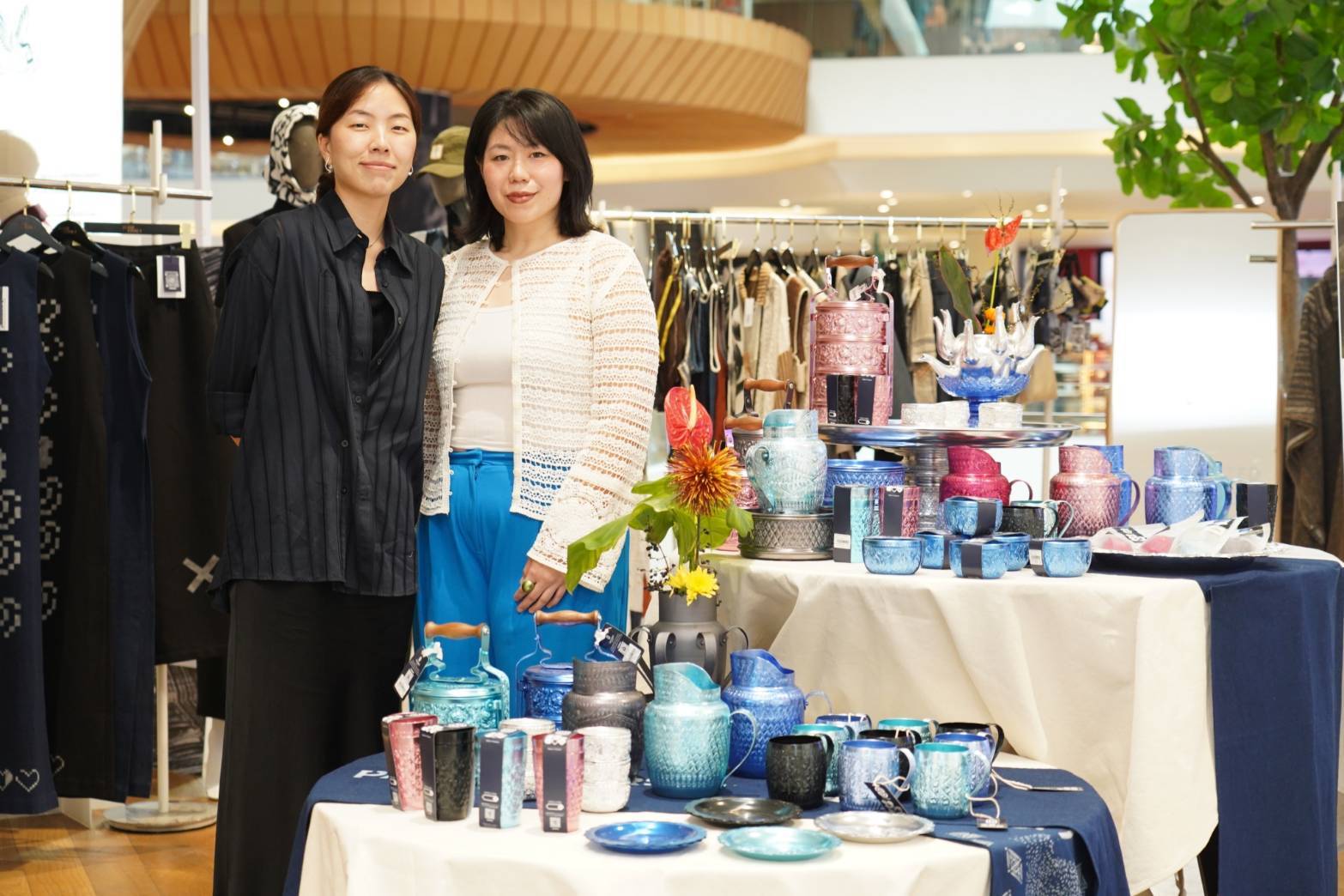 นอกจากนี้นิทรรศการ “ICONCRAFT X PATTERN.ERS CHOKE-LARB POP UP EXHIBITION” ยังร่วมด้วยแบรนด์ “SUCHAI CRAFT” ผู้รังสรรค์ภาชนะอลูมิเนียมลายไทยมานานกว่า 50 ปี ที่พลิกโฉมให้เข้ากับยุคสมัยด้วยการเพิ่มสีสันให้หลากหลาย พร้อมนำเสนอการใช้งานในรูปแบบใหม่ ๆ เปลี่ยนภาพจำของผลิตภัณฑ์อลูมิเนียมลายไทย ให้เป็นของที่ใคร ๆ ก็หยิบมาใช้ได้อย่างร่วมสมัย โดยนำเสนอผลงานชุด “เลิศ ลาภ” ที่หยิบเอาสีสันอันเป็นจุดเด่นของแบรนด์มาเล่าผ่านเรื่องราวของสีมงคล โดย ธนัชชา และ สาริศา ตั้งสุขสว่างพร สองทายาทแบรนด์ SUCHAI CRAFT เล่าถึงคอลเลกชันพิเศษนี้ว่า “แนวคิดของงานครั้งนี้ พูดถึงเรื่องโชคลาภ และเนื่องจาก SUCHAI CRAFT เราโดดเด่นเรื่องสีสัน เลยอยากเอาเรื่องสีมานำเสนอเป็นสีมงคล ซึ่งเรามองว่าเรื่องสีเป็นเรื่องปัจเจก และเราสามาถสร้างความเลิศลาภของเราเองได้ ประกอบกับภาชนะอลูมินียมสีสันของเราสามารถใส่อาหารได้ เราจึงนึกถึงสีโทนสีฟ้า-น้ำเงิน ที่มักจะถูกมองว่านำมาใช้กับอาหารแล้วดูไม่น่ากิน เลยอยากนำโทนสีนี้มาผสมผสานกับนิลกาฬและเงิน นำเสนอเป็นสินค้าตกแต่งโต๊ะอาหาร อย่างถาด ชาม ขัน หรือเหยือก ที่สามารถจัดแต่งทำให้โต๊ะอาหารสวยงามหรูหราขึ้นได้ เพื่อสื่อว่า เราสามารถสร้างสีแห่งโชคลาภได้เอง ขอเพียงเป็นสีที่เรามั่นใจ และใช้ให้ถูกกาลเทศะ ก็จะเป็นสีที่แสดงความเป็น ‘เลิศ’ ซึ่งนำพาเราไปสู่ ‘ลาภ’ ได้นั่นเอง”