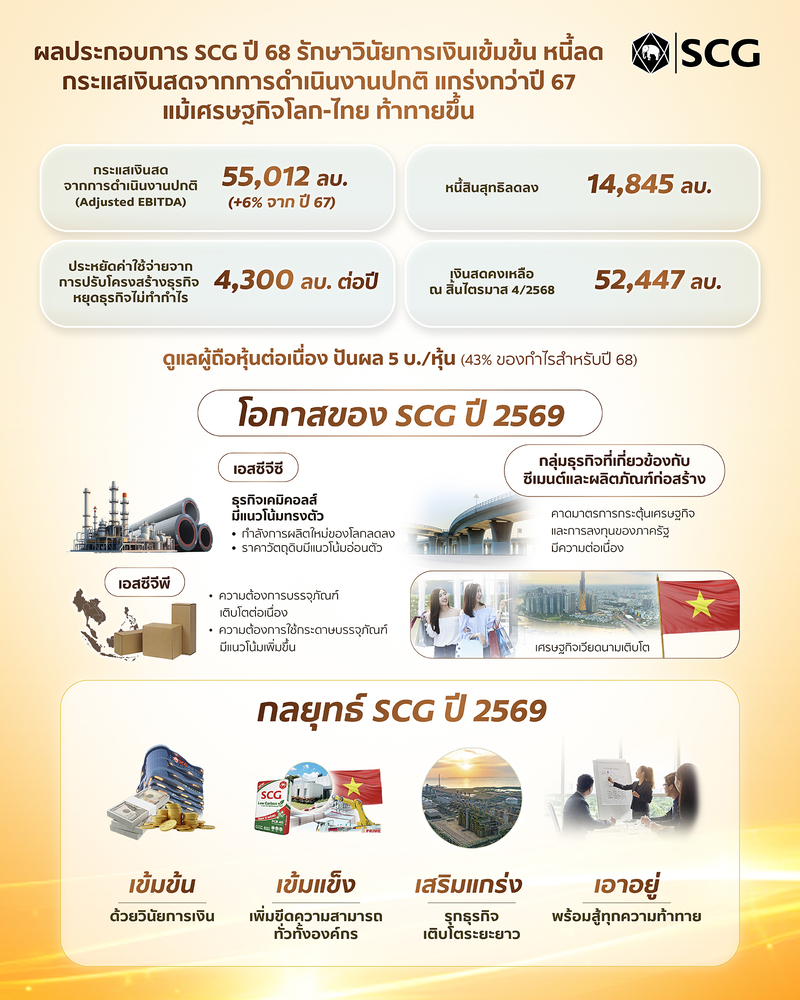 “ปี 2568 เอสซีจีเผชิญความท้าทายจากเศรษฐกิจโลกชะลอตัว ความขัดแย้งทางภูมิรัฐศาสตร์ ต้นทุนพลังงานผันผวน ซึ่งกระทบต่อทุกอุตสาหกรรมโดยเฉพาะปิโตรเคมี ขณะที่ไทย เงินบาทแข็งค่าขึ้น 2.4 บาทต่อดอลลาร์สหรัฐ หรือ 7% จากปีก่อน หนี้ครัวเรือนอยู่ระดับสูง สินค้าราคาถูกจากต่างประเทศเข้ามาแข่งขัน และวิกฤตอุทกภัย แต่เอสซีจีบริหารกระแสเงินสด หัวใจสำคัญของการดำเนินธุรกิจได้ดี โดยกระแสเงินสดจากการดำเนินงานปกติ ที่ไม่รวมรายการพิเศษ (Adjusted EBITDA) 55,012 ล้านบาท แข็งแกร่งกว่าปี 2567 คิดเป็น 6% ขณะที่หนี้สินสุทธิลดลง 14,845 ล้านบาทจากปีก่อน สะท้อนการรักษาวินัยทางการเงินเข้มข้น การบริหารต้นทุนอย่างมีประสิทธิภาพ การปรับโครงสร้างการดำเนินงาน หยุดธุรกิจไม่ทำกำไร และประหยัดค่าใช้จ่าย ได้กว่า 4,300 ล้านบาทต่อปี และการเร่งเพิ่มขีดความสามารถการแข่งขันของทุกธุรกิจ ทั้งยังดูแลผู้ถือหุ้นให้ได้รับผลตอบแทนต่อเนื่อง โดยคณะกรรมการบริษัทฯ มีมติให้เสนอที่ประชุมผู้ถือหุ้นเพื่ออนุมัติจ่ายเงินปันผลประจำปี 2568 ในอัตราหุ้นละ 5.0 บาท รวมเป็นเงิน 6,000 ล้านบาท คิดเป็น 43% ของกำไรสำหรับปี 2568”