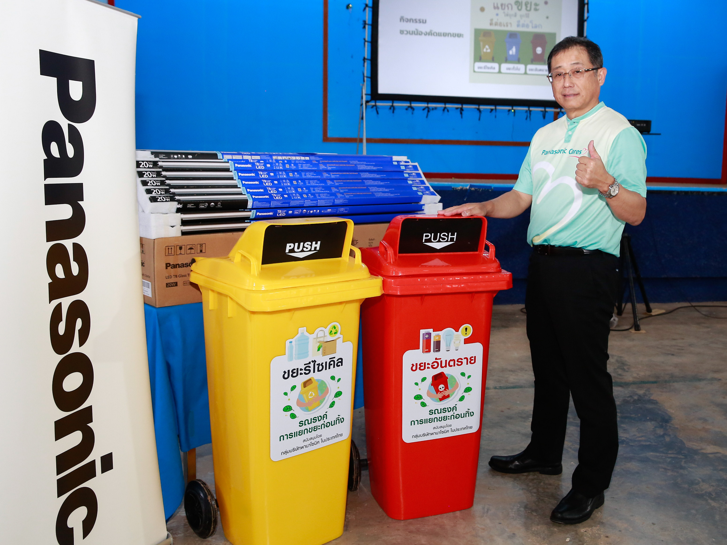 ล่าสุด กลุ่มบริษัทพานาโซนิคในประเทศไทย ร่วมกับ บริษัท เสียงโตเกียว จำกัด สานต่อกิจกรรม “พานาโซนิค ชวนแยกขยะ ลดมลภาวะในชุมชน” ลงพื้นที่จังหวัดชุมพร เพื่อสร้างจิตสำนึกด้านสิ่งแวดล้อมอย่างยั่งยืน โดยมี ฮิเดคาสึ อิโตะ ซีอีโอ กลุ่มบริษัทพานาโซนิค ในประเทศไทย นำทีมพนักงานมอบชุดถังขยะแยกประเภท พร้อมหลอดไฟพานาโซนิค แอลอีดี ประหยัดพลังงาน จำนวน 100 หลอด ให้แก่โรงเรียนปากน้ำชุมพรวิทยา จังหวัดชุมพร เพื่อสนับสนุนการจัดการขยะอย่างถูกวิธี และเสริมสร้างสภาพแวดล้อมที่เอื้อต่อการเรียนรู้ ซึ่งมี ปวีณา นาคหกวิค ผู้อำนวยการ โรงเรียนปากน้ำชุมพรวิทยา เป็นผู้รับมอบ และ เอกพงษ์ เตชะวงศ์ถาวร กรรมการผู้จัดการ บริษัท เสียงโตเกียว จำกัด ร่วมเป็นสักขีพยาน