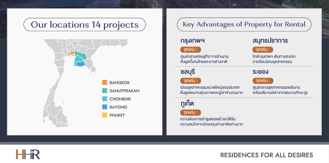 HHR เป็นกลุ่มธุรกิจกลางน้ำ (Living Services) ที่ให้บริการที่เกี่ยวกับการอยู่อาศัยและการใช้ชีวิตหลังจากโครงการแล้วเสร็จ โดยเฉพาะการให้บริหารจัดการ Residential Property และ Service Apartment ปัจจุบัน HHR ได้ขยายพอร์ตโฟลิโอเดิมที่รับบริหารอยู่ 10 โครงการ เพิ่มเป็น 14 โครงการในไตรมาส 1/2569 นี้ ทำให้มีจำนวนห้องพักรวมกว่า 2,000 ยูนิต ครอบคลุม 5 เมืองใหญ่ในพื้นที่เศรษฐกิจและการท่องเที่ยวเที่ยวทั้งในกรุงเทพฯ, สมุทรปราการ, ชลบุรี, ระยอง และภูเก็ต