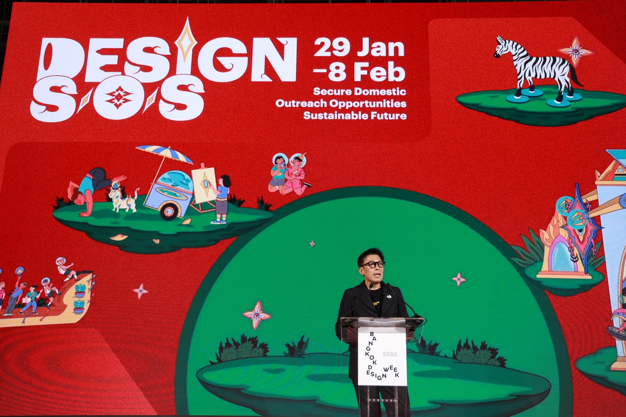 “เทศกาลงานออกแบบกรุงเทพฯ 2569 จัดขึ้นภายใต้ธีม ‘DESIGN S/O/S’ ซึ่งไม่ได้หมายถึงสัญญาณขอความช่วยเหลือเพียงอย่างเดียว แต่ยังสะท้อนภาพรวมของโลกและเมืองที่กำลังเผชิญความท้าทายรอบด้าน ทั้งความผันผวนทางเศรษฐกิจ ความซับซ้อนของภูมิรัฐศาสตร์ การเปลี่ยนแปลงสภาพภูมิอากาศ และบริบทการค้าโลกที่เปลี่ยนแปลงรวดเร็ว เทศกาลฯ จึงตั้งคำถามสำคัญว่าในบริบทเช่นนี้ การออกแบบจะช่วยให้เมือง ธุรกิจ และผู้คน ‘รอด’ และ ‘ไปต่อ’ ได้อย่างไร ผ่าน 3 แกนหลัก คือ Secure Domestic สร้างความแข็งแรงจากฐานภายใน, Outreach Opportunities เปิดโอกาสใหม่และเชื่อมต่อสู่เวทีโลก, และ Sustainable Future ออกแบบทางรอดที่ยั่งยืนสำหรับอนาคต