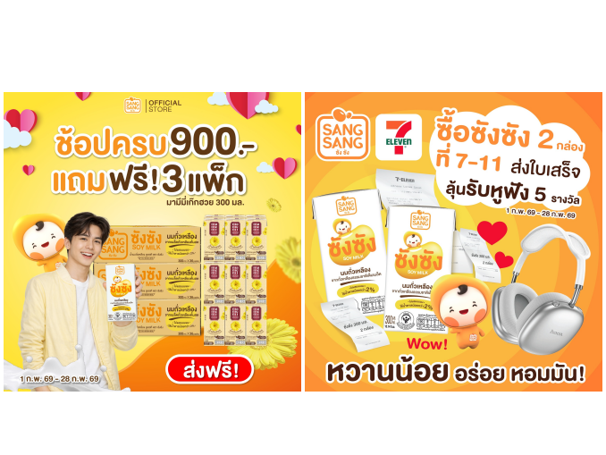 กุมภาพันธ์นี้มีแต่ความฟิน! นมถั่วเหลืองแบรนด์ ซังซัง ชวนทุกคนมาร่วมส่งต่อความอร่อยเพื่อลุ้นรางวัลใหญ่ Giftset Sangsang พร้อมหูฟัง Hoco มูลค่า 990 บาท จำนวน 5 รางวัล กติกาง่ายๆ เพียงซื้อซังซัง ขนาด 300 มล. จำนวน 2 กล่อง ที่ 7-Eleven ทุกสาขา แล้วเขียนชื่อลงบนใบเสร็จให้ชัดเจน แล้วถ่ายรูปใบเสร็จให้เห็นรายการซื้อนมถั่วเหลืองซังซัง จากนั้นโพสต์รูปใบเสร็จพร้อมรีวิวความอร่อยชวนเพื่อนๆ มาดื่มและบอกพิกัด 7-Eleven โซนที่ซื้อ ลงในคอมเมนต์ใต้โพสต์กิจกรรมเพื่อยืนยันการร่วมกิจกรรม โดยสามารถร่วมสนุกและโชว์รีวิวที่โดนใจที่สุดได้ตั้งแต่วันนี้ถึง 28 กุมภาพันธ์ 2569 ประกาศผลผู้โชคดีวันที่ 5 มีนาคม 2569 และยืนยันสิทธิ์ภายในวันที่ 10 มีนาคม 2569 ติดตามรายละเอียดเพิ่มเติมได้ที่ https://bit.ly/3w0PQ5o