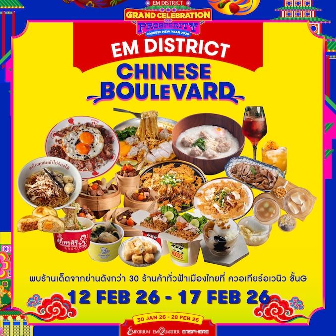 หอยนางรมแห้งผัดฟาฉ่อยปวยเล้ง, เป็ดย่างโฟร์ซี่ซั่น จาก FOUR SEASONS CHINESE RESTAURANT,ขาห่านอบบะหมี่ จาก HONG BAO บะหมี่น้ำเกี๊ยวกุ้งซิกเนเจอร์ จาก MAK’S NOODLE,บะหมี่เนื้อตุ๋นจักรพรรดิ จากโรงกลั่นเนื้อ,ไก่แช่เหล้า, กระเพาะปลา จาก โต๊ะคิม, ซุปงาดำ โมจิเผือกสด จาก BA HAO TIAN MI, ขาหมูเลิศพะโล้ สูตรเชฟกิ๊ก จาก NAPHA เป็นต้น นอกจากนั้น ยังมีตลาดที่รวบรวมร้านอาหารจีนชื่อดังหาทานยากจากย่านดัง กว่า 30 ร้านค้าทั่วประเทศ มาไว้ที่เดียวใน “EM DISTRICT CHINESE BOULEVARD” เพื่อให้ทุกคนได้ร่วมแบ่งปันช่วงเวลาแห่งความอร่อยและความสุขไปด้วยกัน ระหว่างวันที่ 12 – 17 กุมภาพันธ์ 2569 ณ บริเวณควอเทียร์ อเวนิว ชั้น G ศูนย์การค้าเอ็มควอเทียร์ และยัง ระหว่างวันที่ 10 – 28 กุมภาพันธ์ 2569 ณ เอ็ม ดิสทริค
