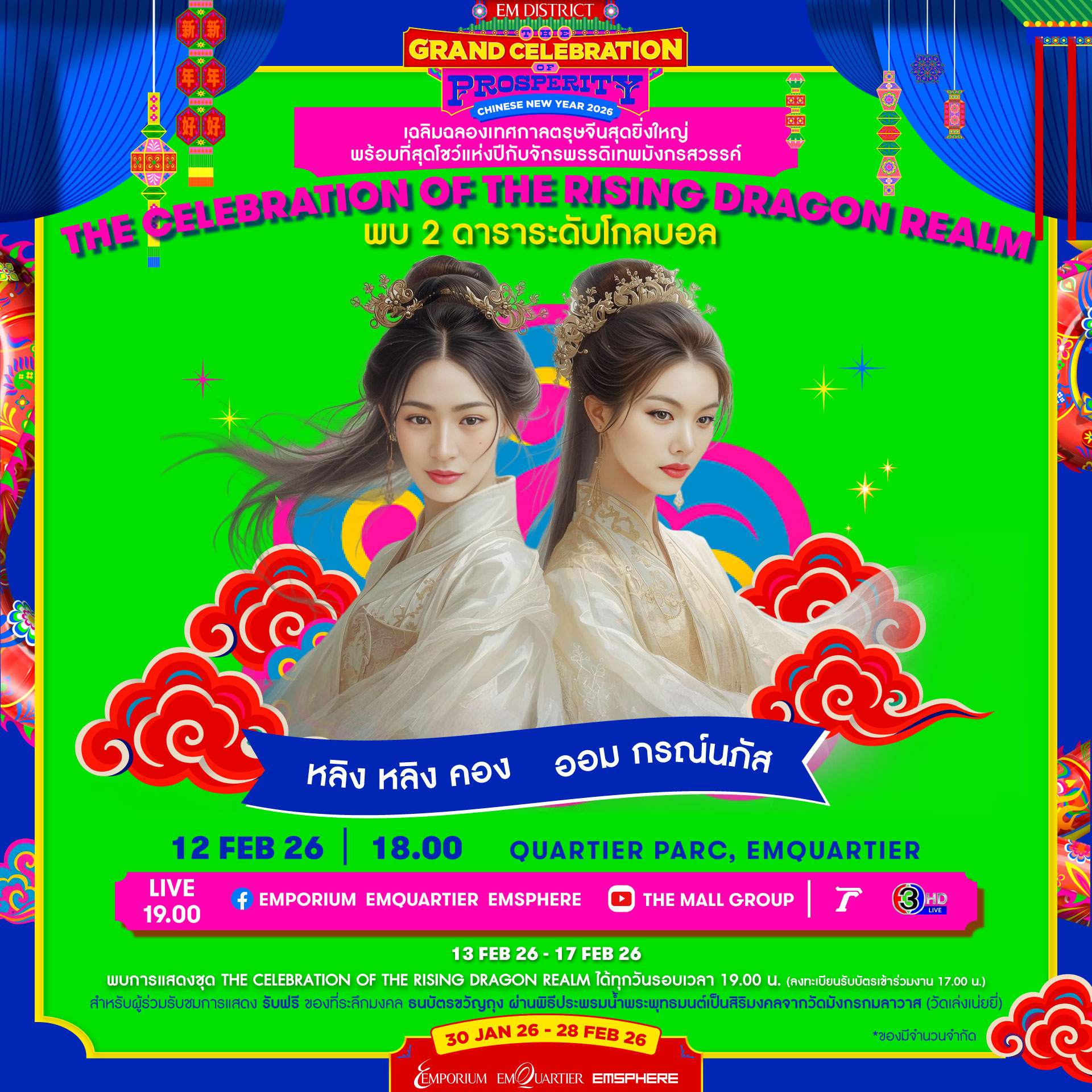 “EM DISTRICT: THE GRAND CELEBRATION OF PROSPERITY CHINESE NEW YEAR 2026 ตื่นตากับ World Class Performance จาก 2 ดาราระดับโกลบอล “หลิง – ออม” พร้อมอิ่มอร่อยเสริมความเฮง ความปัง กับเมนูมงคลจากร้านค้าชั้นนำในศูนย์การค้า และร้านอาหารจีนชื่อดังหาทานยากกว่า 30 ร้านจากทั่วประเทศ ตั้งแต่วันนี้ – 28 กุมภาพันธ์ 2569 ที่ เอ็ม ดิสทริค มอบความพิเศษและความมงคลมากมายได้แก่