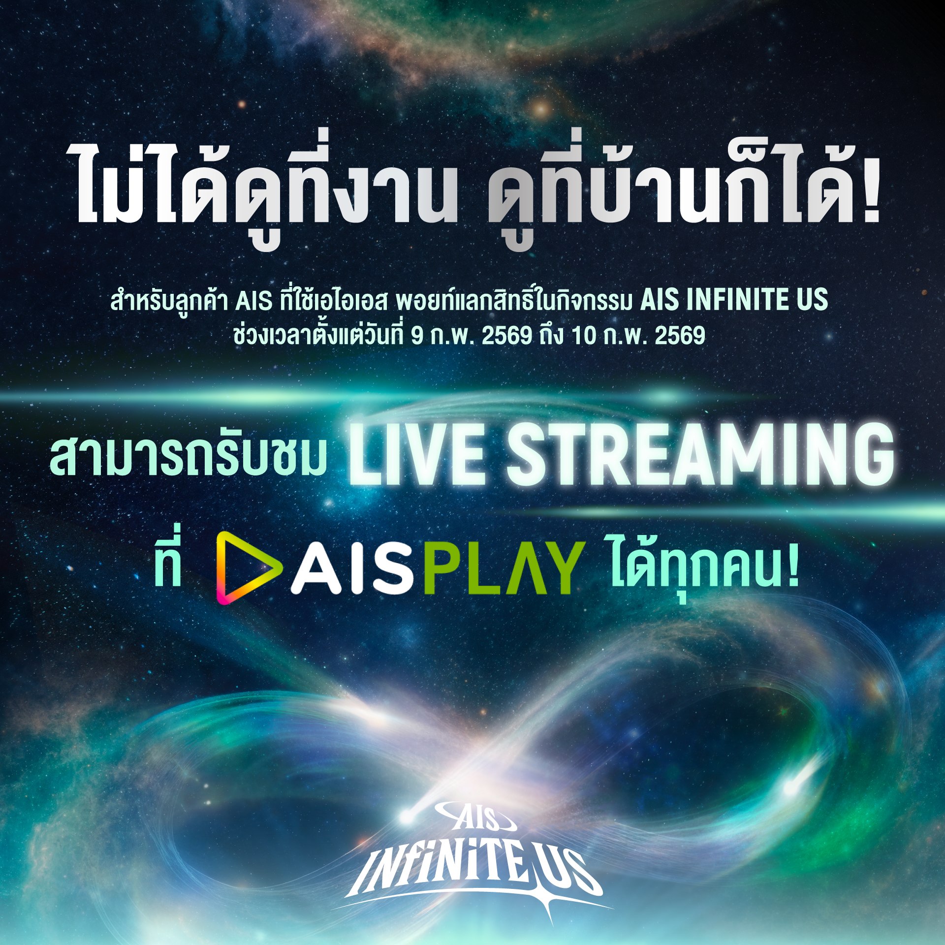 พิเศษ! สำหรับลูกค้าเอไอเอส ที่ใช้เอไอเอส พอยท์แลกสิทธิ์ในกิจกรรม AIS INFINITE US ช่วงเวลาตั้งแต่วันที่ 9 ก.พ. 2569 ถึง 10 ก.พ. 2569 สามารถรับชมการแสดงผ่าน LIVE STREAMING ที่ AIS PLAY ได้ทุกคน!