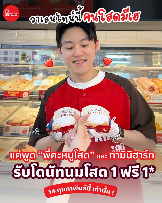 Mister Donut (มิสเตอร์ โดนัท) จัดเต็มให้ คนโสดมีเฮ กับ โดนัทนมโสด 1 ฟรี 1 แค่พูดกับพนักงานที่ร้านว่า “พี่คะหนูโสด” พร้อมท่ามินิฮาร์ท รับสิทธิ์แลกซื้อโดนัท นมโสด 1 ฟรี 1 เมื่อซื้อเซตโปรโมชั่นเซตใดก็ได้ในร้าน เฉพาะวันที่ 14 กุมภาพันธ์ 2569 เท่านั้น ที่ร้านมิสเตอร์โดนัท ทุกสาขา