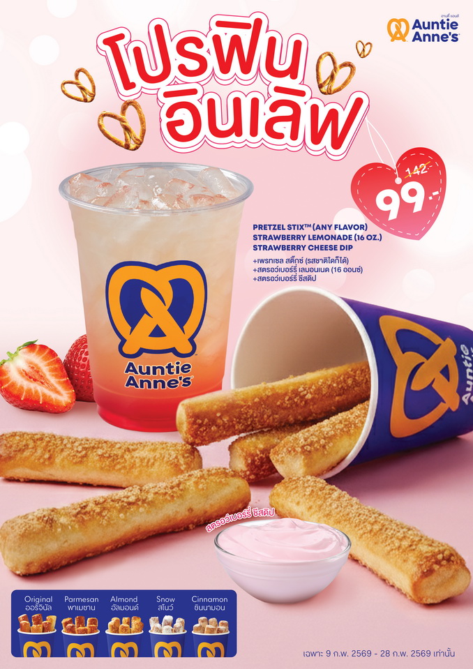 Auntie Anne’s (อานตี้ แอนส์) รับเทศกาลแห่งความรักชวนคุณมาอร่อยแบบคนมีคู่ แต่ถ้ามาเดี่ยวก็ยังฟินได้นะ กับ “โปรฟิน อินเลิฟ” อร่อยไปกับ เพรทเซล สติกซ์ เลือกรสชาติที่คุณชอบได้ มาพร้อมด้วยดิปสตรอว์เบอร์รี ครีมชีส ปิดท้ายความฟินด้วยเครื่องดื่มสตรอว์เบอร์รี เลมอนเนด 16 ออนซ์ อร่อยลงตัวสุดๆ ในราคาเพียง 99 บาทเท่านั้น ตั้งแต่วันนี้ ถึง 28 กุมภาพันธ์ 2569 ที่ร้านอานตี้ แอนส์ทุกสาขา