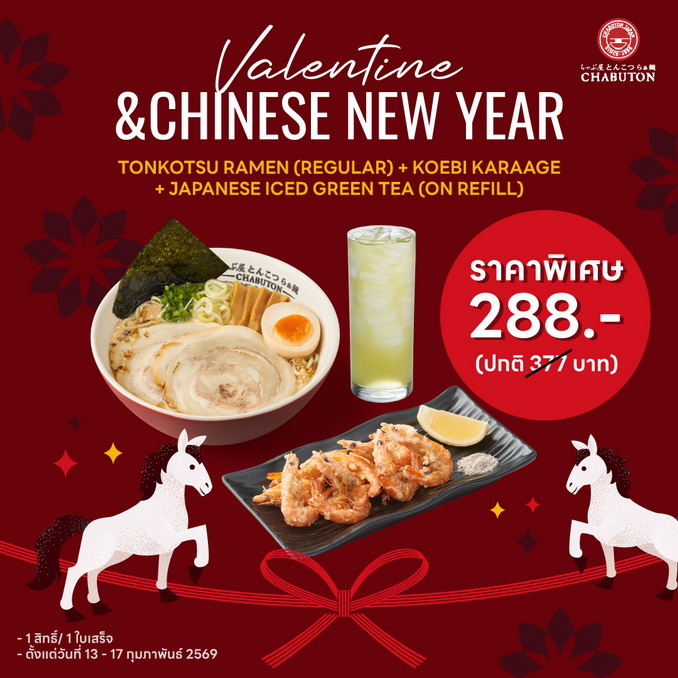 Chabuton (ชาบูตง ราเมน) ชวนคุณมาบอกรักหวานๆในชาวเดียวกัน กับโปร Valentine & Chinese New Year Set เพียงสั่ง Set ที่ประกอบไปด้วย Tonkotsu Ramen + Koebi Karaage + Ice green tea จ่ายเพียง 288 บาท (จากปกติ 377บาท) ช่วงเวลาแห่งความสุข…เริ่มต้นที่ชาบูตง ราเมน ตั้งแต่วันที่ 13 ถึง 17 กุมภาพันธ์ 2569 (หรือจนกว่าสินค้าจะหมด) ที่ร้านชาบูตง ราเมน ทุกสาขา โปรโมชั่นเฉพาะรับประทานที่ร้านเท่านั้น