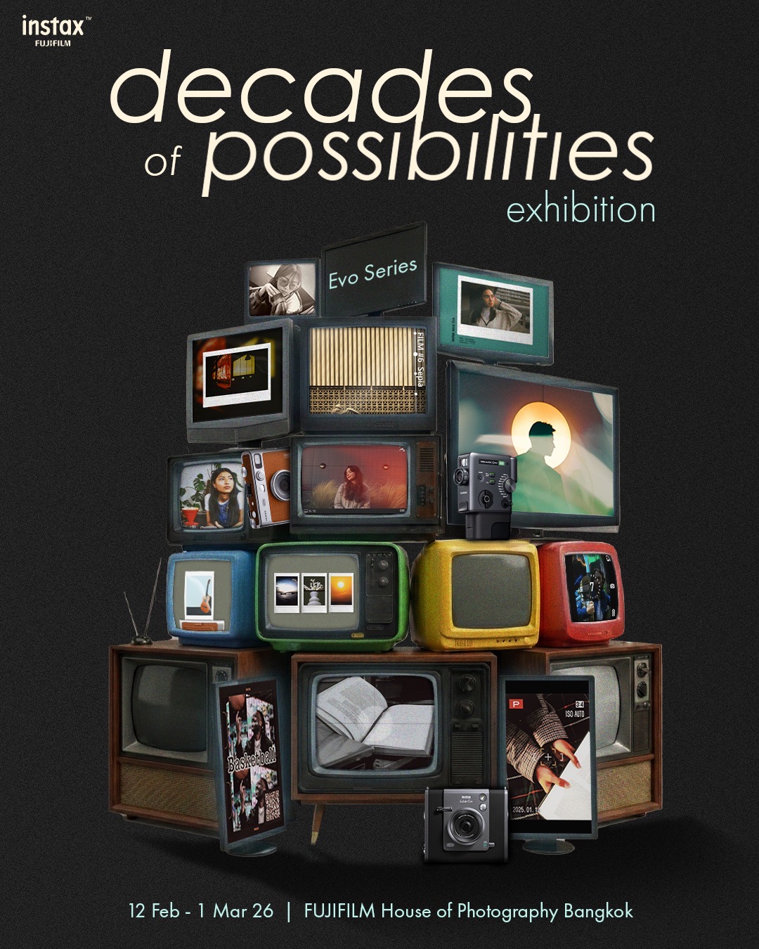 นิทรรศการที่ถ่ายทอดเสน่ห์ของภาพถ่ายและวิดีโอ ผ่านกล้อง instax ในซีรีส์ Evo โดยภายในนิทรรศการได้คัดสรรผลงานชิ้นเอกจากกล้องในซีรีส์ Evo เพื่อสะท้อนอารมณ์และเอกลักษณ์ของภาพถ่าย ตั้งแต่อดีตจนถึงปัจจุบัน ไฮไลต์ของนิทรรศการคือ instax mini Evo Cinema กล้องอินสแตนท์ไฮบริดแบบ 3-in-1 ที่ผสานการถ่ายภาพนิ่ง วิดีโอสั้น และการพิมพ์ภาพไว้ในกล้องเดียว ถ่ายทอดประสบการณ์การสร้างสรรค์ภาพในสไตล์ Cinematic อย่างมีเอกลักษณ์ instax mini Evo Cinema มาพร้อมฟังก์ชัน Eras Dial ที่ได้แรงบันดาลใจจากกล้องฟิล์มในอดีต ให้เลือกเอฟเฟกต์ได้ 10 ยุค พร้อมปรับระดับความเข้มของเอฟเฟกต์ ช่วยถ่ายทอดอารมณ์ของภาพถ่ายและวิดีโอในแต่ละช่วงเวลา เสริมเสน่ห์งานอนาล็อกในมุมมองร่วมสมัย ภายในนิทรรศการยังจัดแสดง instax mini Evo และ instax WIDE Evo กล้องอินสแตนท์ไฮบริดที่เปิดโอกาสให้ผู้ใช้เลือกเอฟเฟกต์เลนส์และฟิล์มได้รวมกว่า 100 รูปแบบ ผ่านจอ LCD ก่อนพิมพ์ เปลี่ยนทุกโมเมนต์ให้กลายเป็นภาพความทรงจำที่จับต้องได้ด้วยเสน่ห์ของ instax