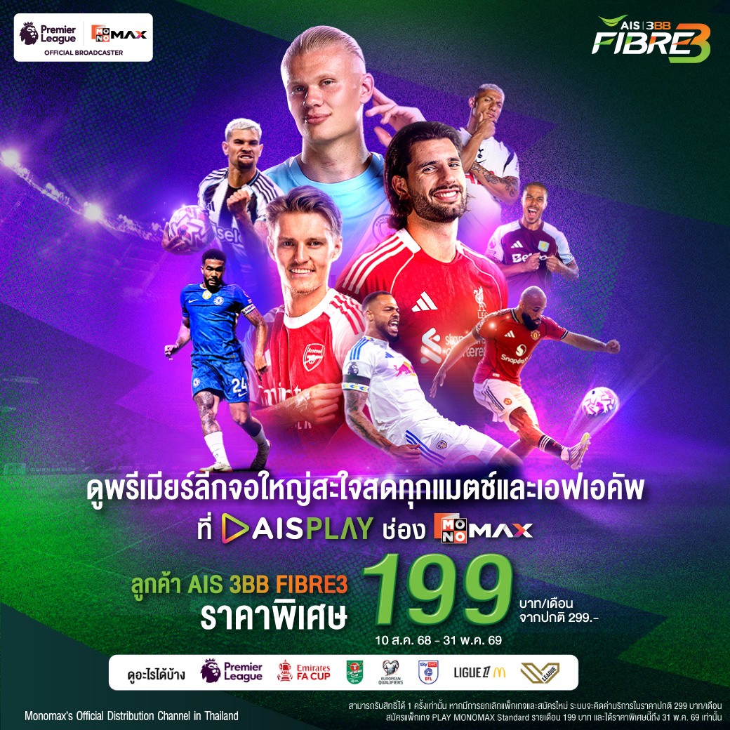 สามารถสมัครแพ็กเกจเสริมดูฟุตบอลพรีเมียร์ลีกทุกแมตซ์และเอฟเอคัพ ราคาพิเศษเพียง 199 บาท / เดือน (ปกติ 299 บาท / เดือน) เมื่อสมัครเน็ตบ้าน AIS 3BB FIBRE3 แพ็กเกจใดก็ได้ เงื่อนไขเป็นไปตามที่บริษัทกำหนด ตั้งแต่วันนี้ - วันที่ 31 พ.ค. 69