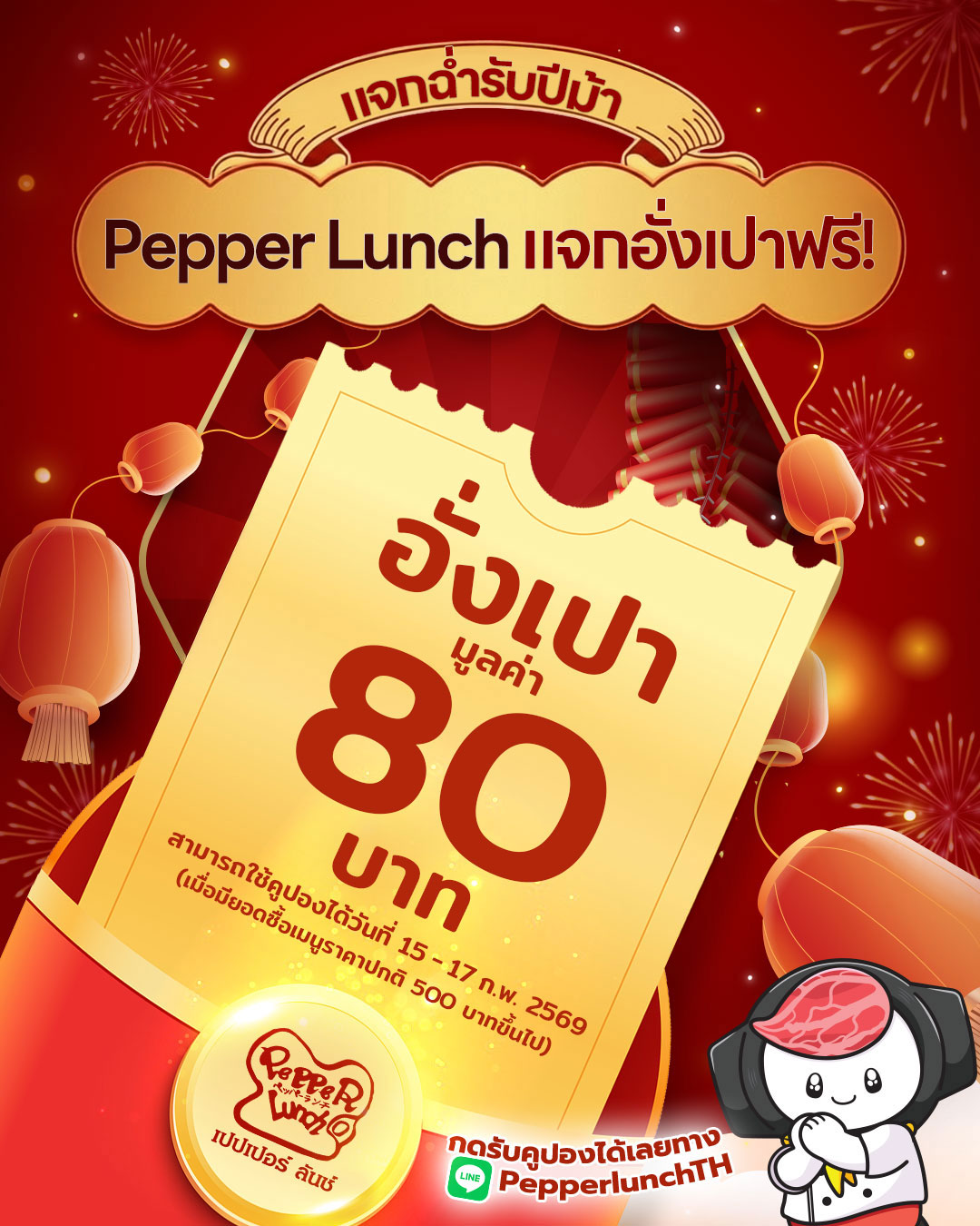 เปปเปอร์ ลันช์ (Pepper Lunch) ขอแจกความ เฮง เฮง เฮง! รับปีม้าแบบปังๆ กับ อั่งเปาฟรี!! ฉลองเทศกาลตรุษจีนด้วยมื้ออร่อยที่ Pepper Lunch พร้อมรับสิทธิ์พิเศษ "อั่งเปาส่วนลด 80 บาท" ให้มื้อนี้ของคุณพิเศษกว่าที่เคย กดรับสิทธิคูปองผ่าน LINE OA (@pepperlunchthailand) และใช้คูปองได้แล้ว ตั้งแต่วันนี้ ถึง 17 กุมภาพันธ์ 2569 เงื่อนไข ใช้ส่วนลดได้เมื่อสั่งอาหารตั้งแต่ 500 บาท จำกัด 1 สิทธิ์ / 1 ใบเสร็จ และไม่สามารถใช้ร่วมกับโปรโมชั่นอื่นได้ที่ร้าน Pepper Lunch ทุกสาขา ยกเว้น สนามบินดอนเมือง และ Food Patio เซ็นทรัลบางนา